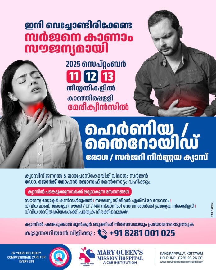 കാഞ്ഞിരപ്പളളി : മേരീക്വീൻസ് മിഷൻ ആശുപത്രിയിലെ ജനറൽ ആൻഡ് ലാപ്രോസ്കോപ്പിക് വിഭാഗത്തിന്റെ ആഭിമുഖ്യത്തിൽ ഹെർണിയ, തൈറോയിഡ് രോഗ / സർജറി നിർണ്ണയ ക്യാമ്പ് 2025 സെപ്റ്റംബർ 11, 12, 13 തീയതികളിൽ നടത്തപ്പെടുന്നു.