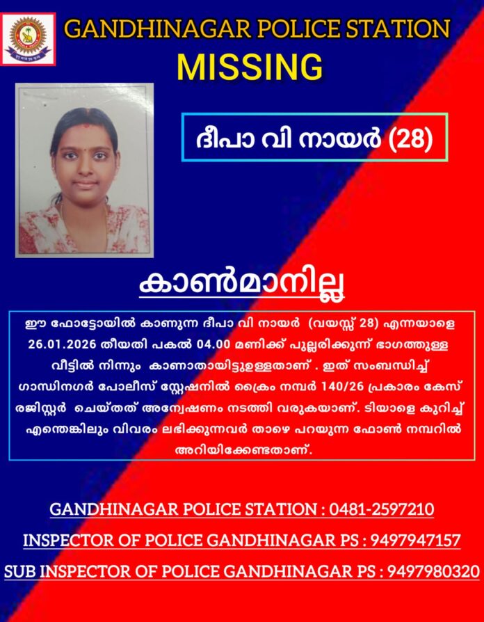 കോട്ടയം:ഗാന്ധിനഗർ പോലീസ് സ്റ്റേഷൻ പരിധിയിൽ നിന്ന് ദീപാ വി നായർ(28)എന്നയാളെ 26/01/2026 തീയതി പകൽ 4മണിക്ക് പുല്ലരിക്കുന്ന് ഭാഗത്തുള്ള വീട്ടിൽ നിന്നും കാണാതായി.