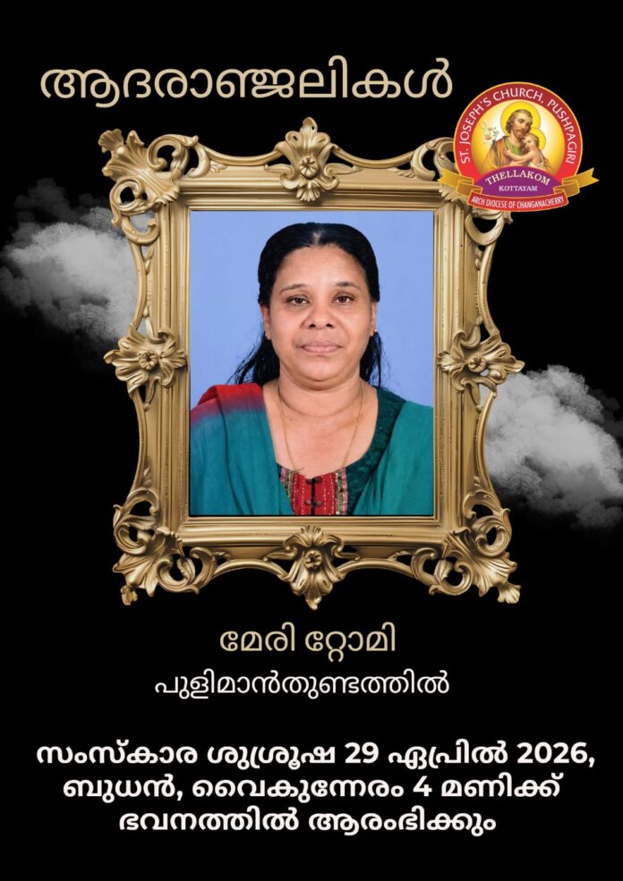 ഏറ്റുമാനൂർ മുൻസിപ്പൽ ചെയർമാൻ ടോമി പുളിമാൻതുണ്ടത്തിലിന്റെ ഭാര്യ മേരി റ്റോമി നിര്യാതയായി April 26, 2026 WhatsAppFacebookXLinkedin Spread the loveതെള്ളകം: ഏറ്റുമാനൂർ മുൻസിപ്പൽ ചെയർമാൻ ടോമി പുളിമാൻ തുണ്ടത്തിലിന്റെ ഭാര്യ മേരി റ്റോമി നിര്യാതയായി. സംസ്കാര ശുശ്രൂഷ ഏപ്രിൽ 29 ബുധൻ വൈകുന്നേരം 4 മണിക്ക് ഭവനത്തിൽ ആരംഭിക്കും. Please enable JavaScriptplay-sharp-fill LinkEmbedCopy and paste this HTML code into your webpage to embed. RELATED ARTICLESMORE FROM AUTHOR കേരളത്തിലെ പ്രമുഖ ഡിജിറ്റല് റീട്ടെയില് ശൃംഖലയായ ഓക്സിജന് ദി ഡിജിറ്റല് എക്സ്പേര്ട്ടിന്റെ റാന്നിയിലെ വിപുലീകരിച്ച ഷോറൂമിന്റെ ഉദ്ഘാടനം ആന്റോ ആന്റണി എം.പി. നിര്വഹിച്ചു;അഡ്വ. പ്രമോദ് നാരായണന് എം.എല്.എ. ആദ്യവില്പ്പന നടത്തി;ബംബര് കോംബോ ഓഫറിലൂടെ... സംസ്ഥാനത്ത് സ്വർണ്ണവിലയിൽ മാറ്റമില്ല; അറിയാം കോട്ടയം അരുൺസ് മരിയാ ഗോൾഡിലെ ഇന്നത്തെ (25/04/2026) സ്വർണ്ണവില കോട്ടയം ചാന്നാനിക്കാട് തോപ്പിൽ സുമതി തങ്കപ്പൻ (83) നിര്യാതയായി പുലിക്കുട്ടിശേരി (പ്രാപ്പുഴ) പെരുവനപ്പറമ്പിൽ നളിനി (92) നിര്യാതയായി സംസ്ഥാനത്ത് സ്വർണ്ണവിലയിൽ നേരിയ ഇടിവ്; സ്വർണ്ണം ഇന്ന്, (22/04/2026) ഗ്രാമിന് 50 രൂപ കുറഞ്ഞു; അറിയാം കോട്ടയം അരുൺസ് മരിയാ ഗോൾഡിലെ സ്വർണ്ണവില സംസ്ഥാനത്ത് ഇന്ന് (21/04/2026) സ്വർണ്ണവിലയിൽ മാറ്റമില്ല; അറിയാം കോട്ടയം അരുൺസ് മരിയാ ഗോൾഡിലെ സ്വർണ്ണവില
