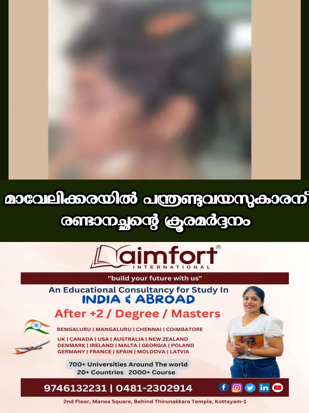 മാവേലിക്കര: പല്ലാരിമംഗലത്ത് രണ്ടാനച്ഛന്റെ ക്രൂരമർദ്ദനമേറ്റ 12 വയസുകാരനെ മാവേലിക്കര ജില്ലാ ആശുപത്രിയിൽ പ്രവേശിപ്പിച്ചു. വീണുപരിക്കേറ്റെന്ന് പറഞ്ഞ് കുട്ടിയെ രണ്ടാനച്ഛൻ തന്നെയാണ് കുട്ടിയെ ചികിത്സക്ക് ആശുപത്രിയിൽ കൊണ്ടുവന്നത്.