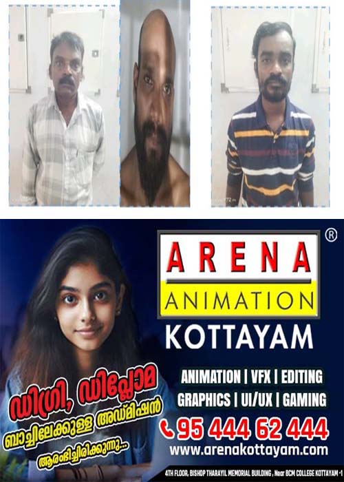 തൃക്കൊടിത്താനം വില്ലേജിൽ അമര താഴത്തുമുറിയിൽ ശ്രീജിത്ത് സുന്ദരൻ, അമര ഭാഗത്ത് മംഗലം വീട്ടിൽ കുട്ടപ്പൻ മകൻ പ്രകാശ്, അമര ഭാഗത്ത് മംഗലം വീട്ടിൽ രമേശ് മകൻ രതീഷ് എന്നിവരാണ് പിടിയിലായത്.