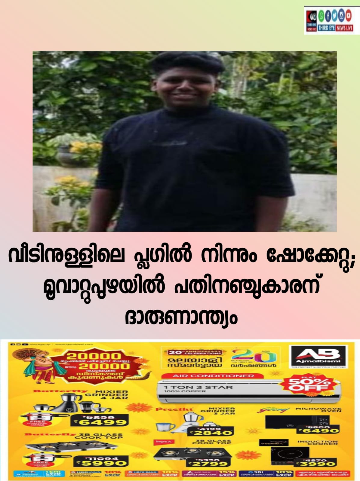 വീടിനുള്ളിലെ പ്ലഗ് പ്രവർത്തിപ്പിക്കാൻ ശ്രമിക്കുന്നതിനിടെ ഷോക്കേൽക്കുകയിരുന്നു .ഉടൻ മൂവാറ്റുപുഴയിലെ സ്വകാര്യ ആശുപത്രീയിൽ പ്രവേശിപ്പിച്ചെങ്കിലും ജീവൻ രക്ഷിക്കാനായില്ല.
