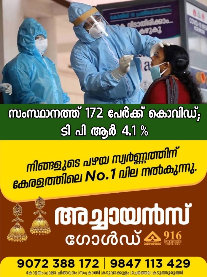 തിരുവനന്തപുരം: സംസ്ഥാനത്ത് ഇന്നലെ 172 പേർക്ക് കൊവിഡ് സ്ഥിരീകരിച്ചു. ടി പി ആർ 4.1 ശതമാനമാണ്. ഇപ്പൊൾ കേരളത്തിലെ ആകെ കൊവിഡ് കേസുകളുടെ എണ്ണം 1026 ആയി. ആശങ്കപ്പെടേണ്ട സാഹചര്യമില്ലെന്ന് ആരോഗ്യമന്ത്രി വീണ ജോർജ് പറഞ്ഞു. കൊവിഡ് സാഹചര്യം വിലയിരുത്താൻ ആരോഗ്യവകുപ്പിന്റെ കൊവിഡ് അവലോകന യോഗം രാവിലെ 11 മണിക്ക് നടക്കും.