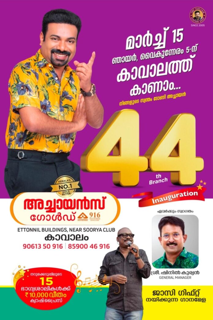 പരിപാടികളുടെ ഭാഗമായി ജാസി ഗിഫ്റ്റ് നയിക്കുന്ന ഗാനമേളയും ഉണ്ടായിരിക്കും. ഉദ്ഘാടന ചടങ്ങിലേക്ക് എല്ലാ കാവാലത്തുകാരെയും സ്വാഗതം ചെയ്യുന്നതായി അച്ചായൻസ് ഗോൾഡ് മാനേജിങ് ഡയറക്ടർ ടോണി വർക്കിച്ചനും, ജനറൽ മാനേജർ ഷിനിൽ കുര്യനും അറിയിച്ചു.