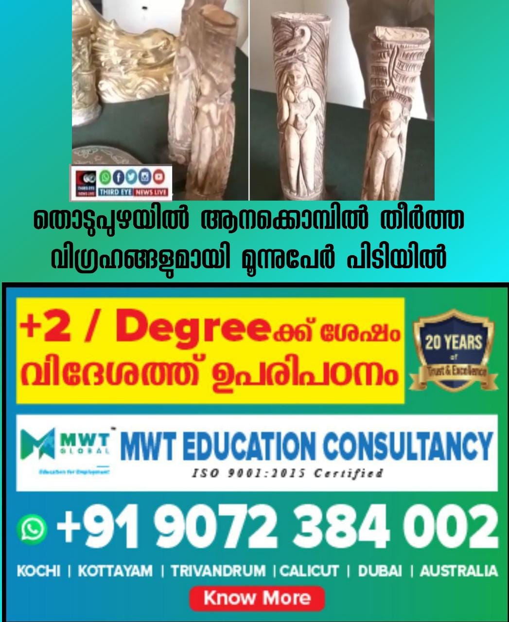 ഇടുക്കി : തൊടുപുഴയില് ആനക്കൊമ്പില് തീര്ത്ത വിഗ്രഹങ്ങളുമായി മൂന്നുപേര് പിടിയിലായി. ഒരടി വലുപ്പമുള്ള രണ്ട് വിഗ്രഹങ്ങള് വനം വകുപ്പിന്റെ വിജിലന്സ് ഫ്ളൈയിംഗ് സ്ക്വാഡ് പിടിച്ചെടുത്തു. 25 ലക്ഷം രൂപയ്ക്ക് വില്ക്കാന് ശ്രമിച്ച രണ്ട് സ്ത്രീ ശില്പങ്ങളാണ് പിടികൂടിയത്.