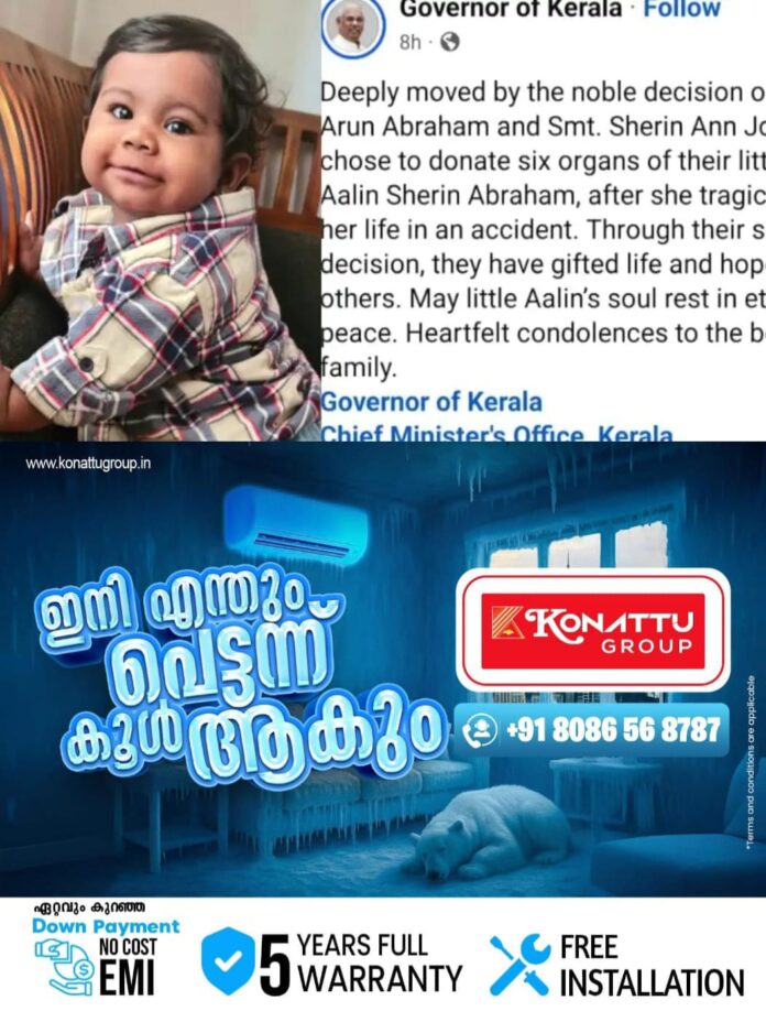 ‘അപകടത്തില് ദാരുണമായി ജീവൻ നഷ്ടപ്പെട്ട കൊച്ചു മാലാഖയായ ആലിൻ ഷെറിൻ എബ്രഹാമിന്റെ അവയവങ്ങള് ദാനം ചെയ്യാൻ തീരുമാനിച്ച അരുണ് എബ്രഹാമിന്റെയും ഷെറിൻ ആൻ ജോണിന്റെയും ഉദാത്തമായ തീരുമാനം എന്നെ വളരെയധികം സ്പർശിച്ചുവെന്നും ആ നിസ്വാർത്ഥ തീരുമാനത്തിലൂടെ, അവർ മറ്റുള്ളവർക്ക് ജീവിതവും പ്രത്യാശയും സമ്മാനിച്ചു.