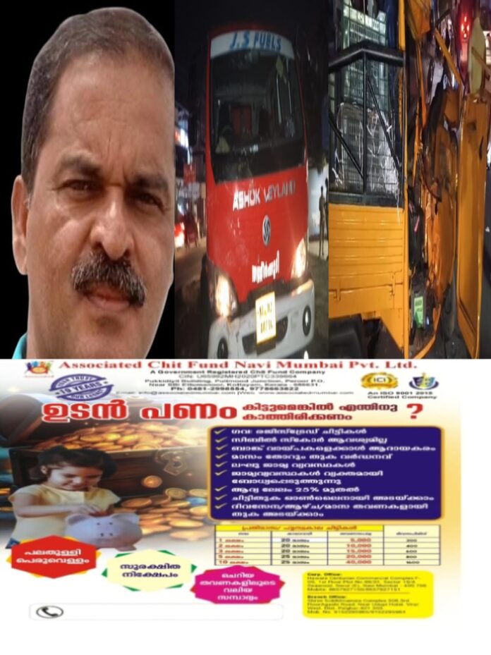 കോട്ടയം : എം.സി. റോഡിൽ സംക്രാന്തിയിലുണ്ടായ വാഹനാപകടത്തിൽ ഒരാൾ മരിച്ചു. കാവാലം അറേബ്യൻ വെജിറ്റബിൾസ് ആൻഡ് ഫ്രൂട്ട്സ് ഉടമ ഏറ്റുമാനൂർ പേരൂർ അഞ്ഞിലിപ്പറമ്പിൽ അനസ്(55) ആണ് മരിച്ചത്.