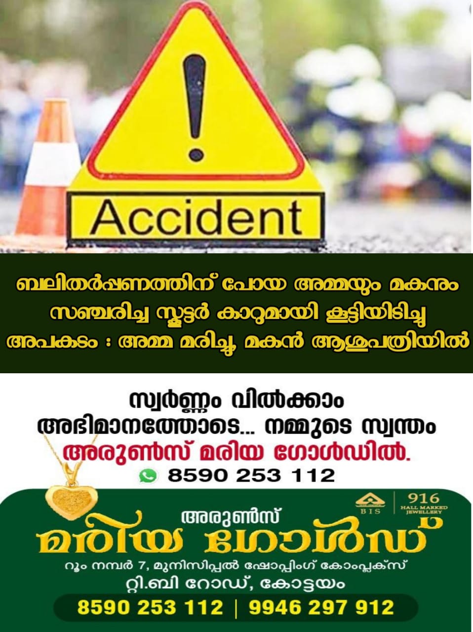 കൊല്ലം: ബലിതർപ്പണത്തിനുപോയ അമ്മയും മകനും സഞ്ചരിച്ച സ്കൂട്ടർ കാറുമായി കൂട്ടിയിടിച്ച് അപകടം. അമ്മയക്ക് ദാരുണാന്ത്യം. മകൻ ഗുരുതരപരിക്കുകളോടെ ആസുപത്രിയിൽ