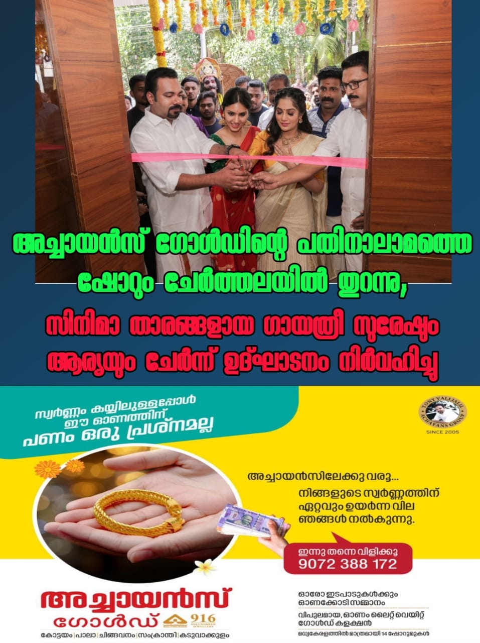 കോട്ടയം : അക്ഷരനഗരിയുടെ വിവാഹസ്വപ്നങ്ങൾക്ക് പകരം വയ്ക്കാനില്ലാത്ത സാന്നിധ്യമായ അച്ചായൻസ് ഗോൾഡിന്റെ പതിനാലാമത്തെ ഷോറും ചേർത്തലയിൽ തുറന്നു.