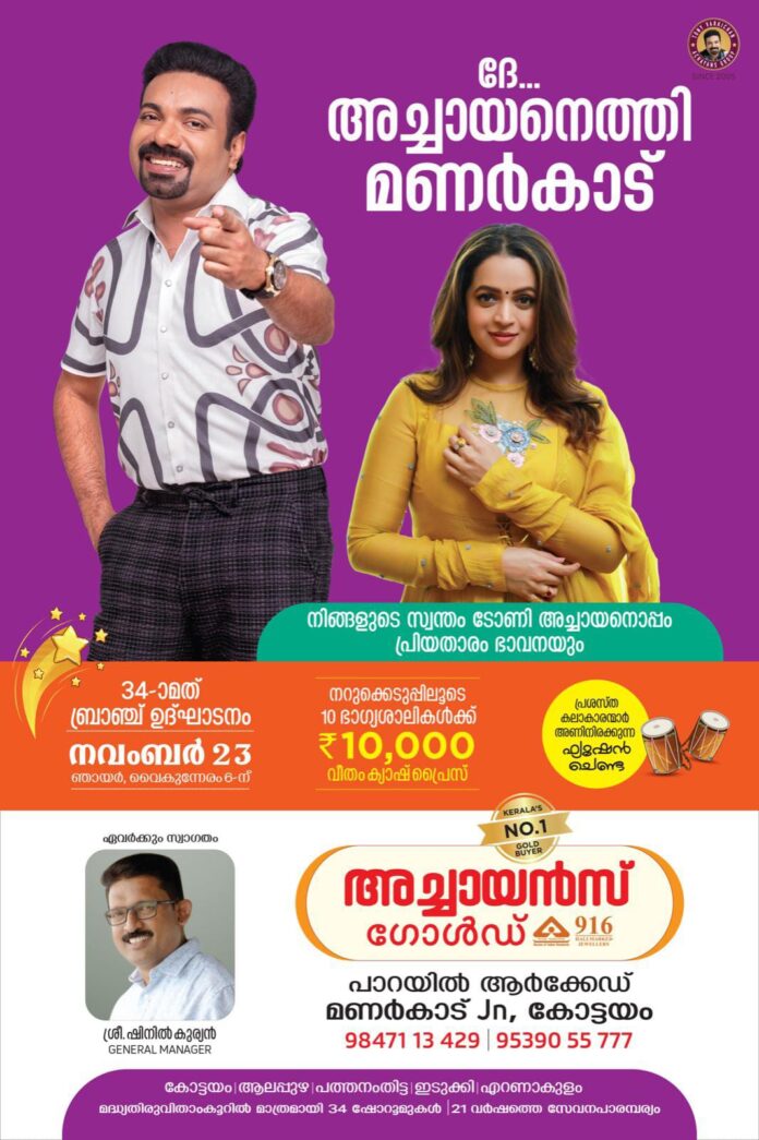 മദ്ധ്യതിരുവിതാംകൂറിൽ മാത്രമായി 34 ഷോറൂമുകൾ, 21 വർഷത്തെ സേവന പാരമ്പര്യം; മണർകാടിന് മാറ്റേകാൻ ഇനി അച്ചായൻസ് ഗോൾഡും ; നവംബർ 23 ഞായറാഴ്ച വൈകിട്ട് 6 മണിക്ക് പ്രശസ്ത നടി ഭാവനയും അച്ചായൻസ് ഗോൾഡ് മാനേജിംഗ് ഡയറക്ടർ ടോണി വർക്കിച്ചനും ചേർന്ന് ഉദ്ഘാടനം ചെയ്യുന്നു ; അപ്പോൾ ഞായറാഴ്ച്ച വൈകിട്ട് എന്താ പരിപാടി..? മണർകാട് കാണണം