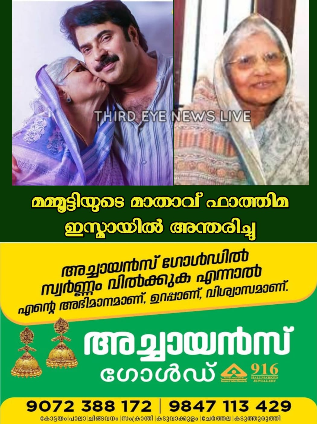 കോട്ടയം: നടന് മമ്മൂട്ടിയുടെ മാതാവ് ഫാത്തിമ ഇസ്മായില് (93) അന്തരിച്ചു. വാർധക്യസഹജമായ അസുഖത്തെ തുടർന്നാണ് മരണം. കൊച്ചിയിലെ സ്വകാര്യ ആശുപത്രിയിൽ ഇന്നു പുലർച്ചെയായിരുന്നു അന്ത്യം.