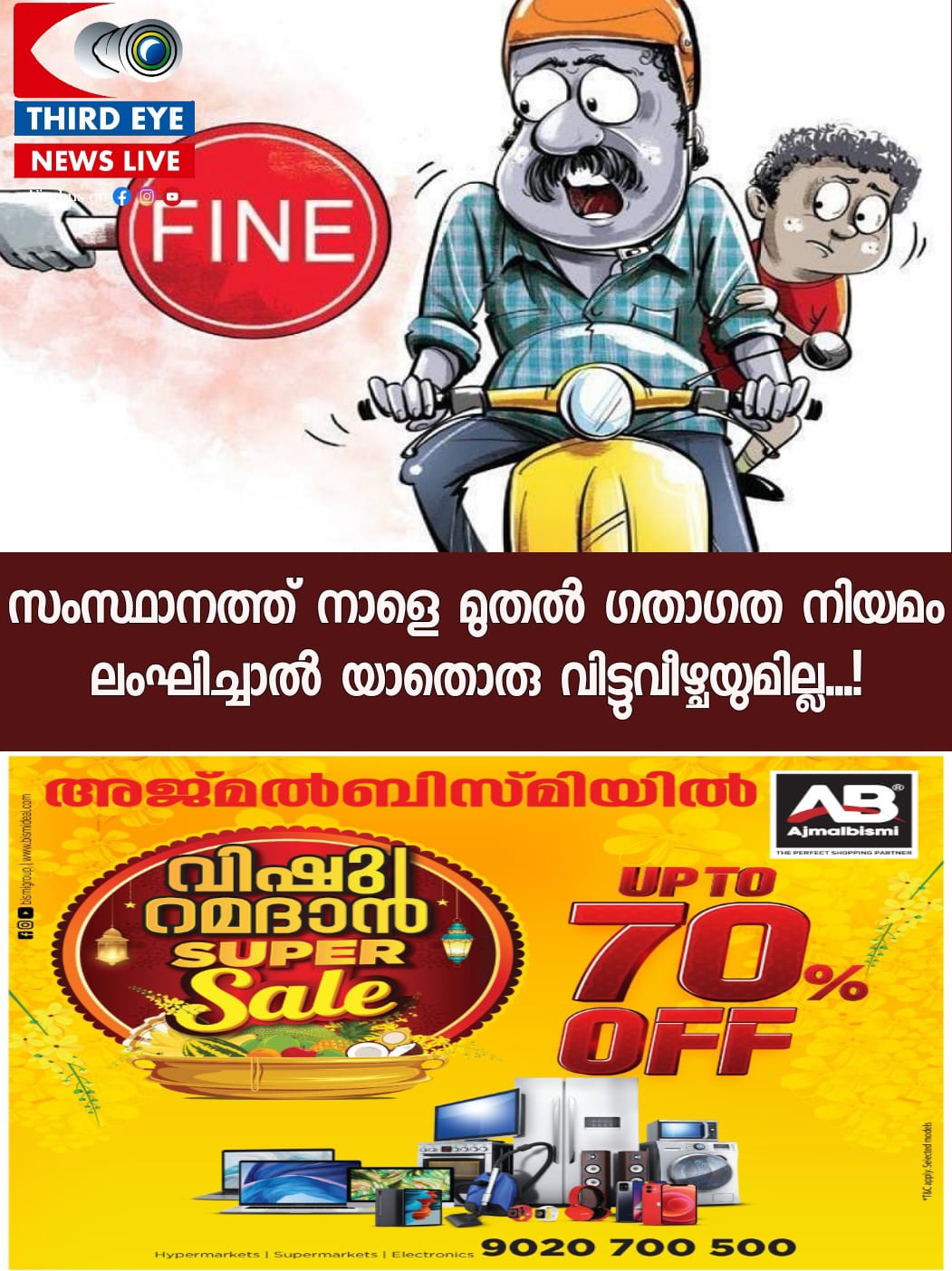 ഹെല്മെറ്റും സീറ്റ് ബെല്റ്റും ഇല്ലെങ്കില് 500 രൂപയാണ് പിഴ. അമിതവേഗത്തിന് 1500 രൂപ, മൊബൈല് ഫോണ് ഉപയോഗിച്ച് ഡ്രൈവിങ് ചെയ്താല് 2000 രൂപ, അനധികൃതപാര്ക്കിങിന് 250 രൂപ, പിന്സീറ്റില് ഹെല്മെറ്റ് ഇല്ലെങ്കില് 500 രൂപ, മൂന്ന് പേരുടെ ബൈക്ക് യാത്ര 1000 രൂപയാണ് പിഴയെന്നും അദ്ദേഹം പറഞ്ഞു.