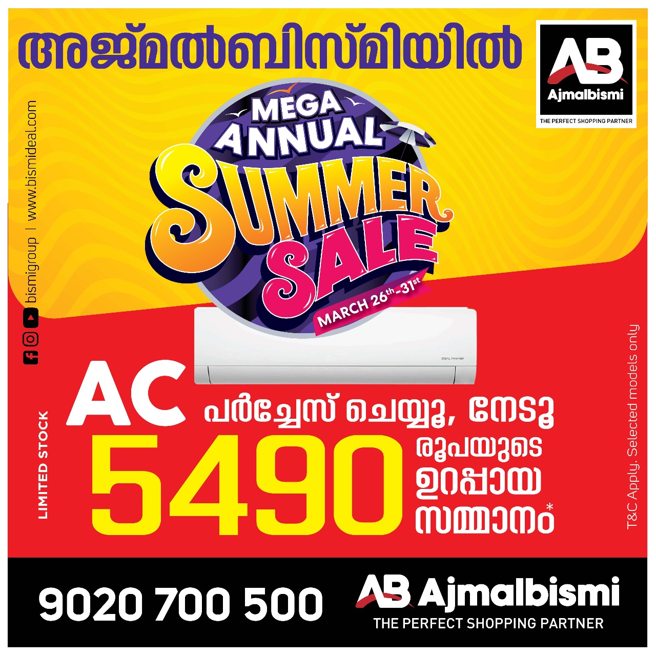 കോട്ടയം: അജ്മൽബിസ്മിയിൽ വിസ്മയിപ്പിക്കും വിലക്കുറവുമായി ആനുവൽ സമ്മർ സെയിൽ. സൗത്ത് ഇന്ത്യയിലെ ഏറ്റവും വലിയ റീട്ടെയിൽ ഗ്രൂപ്പായ അജ്മൽബിസ്മിയിൽ വിസ്മയിപ്പിക്കും വിലക്കുറവുമായി സമ്മർ സെയിൽ. എസികൾ, റെഫ്രിജറേറ്ററുകൾ, കൂളറുകൾ, ഫാനുകൾ തുടങ്ങിയവക്കൊപ്പം ഡിജിറ്റൽ ഗാഡ്ജെറ്റ്സ്, ഗൃഹോപകരണങ്ങൾ എന്നിവയ്ക്കും മികച്ച വില ക്കുറവാണ് ഒരുക്കിയിരിക്കുന്നത്.