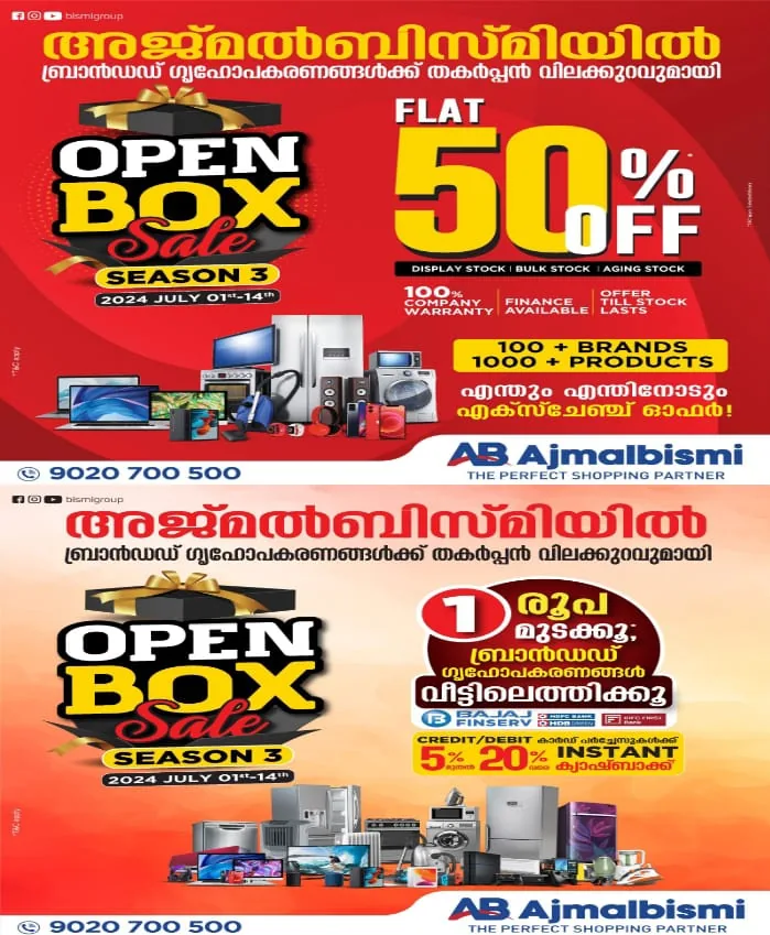 സൗത്ത് ഇന്ത്യയിലെ ഏറ്റവും വലിയ റീട്ടെയിൽ ഗ്രൂപ്പായ അജ്മൽ ബിസ്മിയിൽ ഡിജിറ്റൽ ഗാഡ്ജറ്റുകൾ, ഹോം അപ്ലയൻസസുകൾ, കിച്ചൺ അപ്ലയൻസസുകൾ എന്നിവക്ക് ഫ്ലാറ്റ് 50% വിലക്കുറവുമായി ഓപ്പൺ ബോക്സ് സെയിൽ സീസൺ 3.
