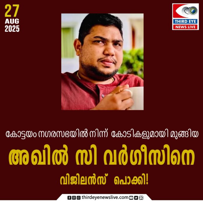 കോട്ടയം : കോട്ടയം നഗരസഭയിൽ നിന്ന് മൂന്നുകോടി രൂപയുടെ തട്ടിപ്പ് നടത്തി മുങ്ങിയ ജീവനക്കാരൻ അഖിൽ സി വർഗീസ് വിജിലൻസിന്റെ പിടിയിൽ. കൊല്ലത്ത് നിന്നാണ് ഇയാളെ വിജിലൻസ് പിടികൂടിയത്