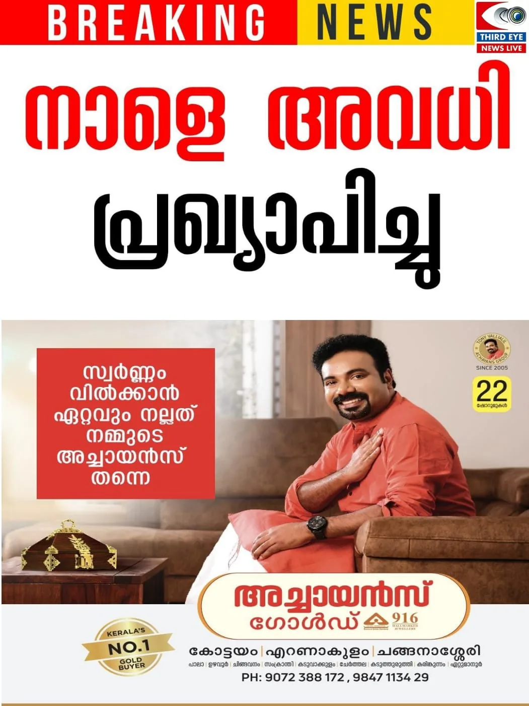 ആലപ്പുഴ ജില്ലയിലെ കുട്ടനാട്,ചെങ്ങന്നൂർ, ചേർത്തല,അമ്പലപ്പുഴ താലൂക്കുകളിലെ താലൂക്കുകളിലെ പ്രൊഫഷണൽ കോളേജുകൾ ഉൾപ്പെടെയുള്ള എല്ലാ വിദ്യാഭ്യാസ സ്ഥാപനങ്ങൾക്കും ട്യൂഷൻ സെൻ്ററുകൾക്കും അംഗനവാടികൾക്കും ജില്ലാ കളക്ടർ നാളെ അവധി പ്രഖ്യാപിച്ചു.