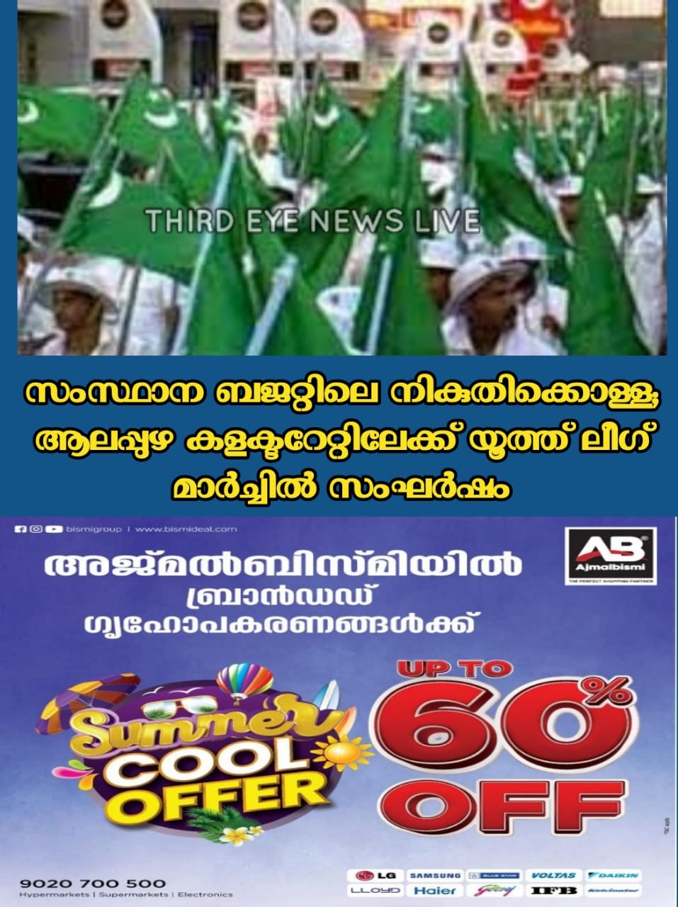 സംസ്ഥാന ബജറ്റിലെ നികുതിക്കൊള്ള; ആലപ്പുഴ കളക്ടറേറ്റിലേക്ക് യൂത്ത് ലീഗ് മാർച്ചിൽ സംഘർഷം; പോലീസ് ജലപീരങ്കി പ്രയോഗിച്ചു