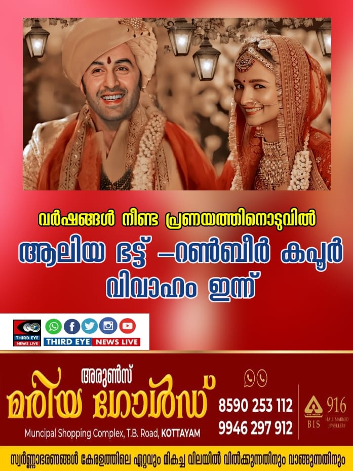 മുംബൈ :ബോളിവുഡ് ലോകം കാത്തിരുന്ന ആ താരവിവാഹം ഇന്ന്. ബോളിവുഡ് താരം ആലിയ ഭട്ടും നടൻ റൺബീർ കപൂറും ഇന്ന് വിവാഹിതരാകും. ഇന്ന് ഉച്ചയ്ക്ക് 2 മണിക്കാകും ചടങ്ങുകൾ ആരംഭിക്കുകയെന്നാണ് റിപ്പോർട്ട്.