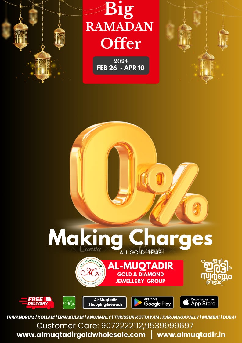 കോട്ടയം: അൽ മുക്താദീർ ജ്വല്ലറി ഗ്രൂപ്പിൻ്റെ കേരളത്തിലെ എല്ലാ ഷോറൂമുകളിലും ആഭരണങ്ങൾക്ക് പണിക്കൂലിയില്ലാതെ വാങ്ങാൻ സുവർണ്ണാവസരം
