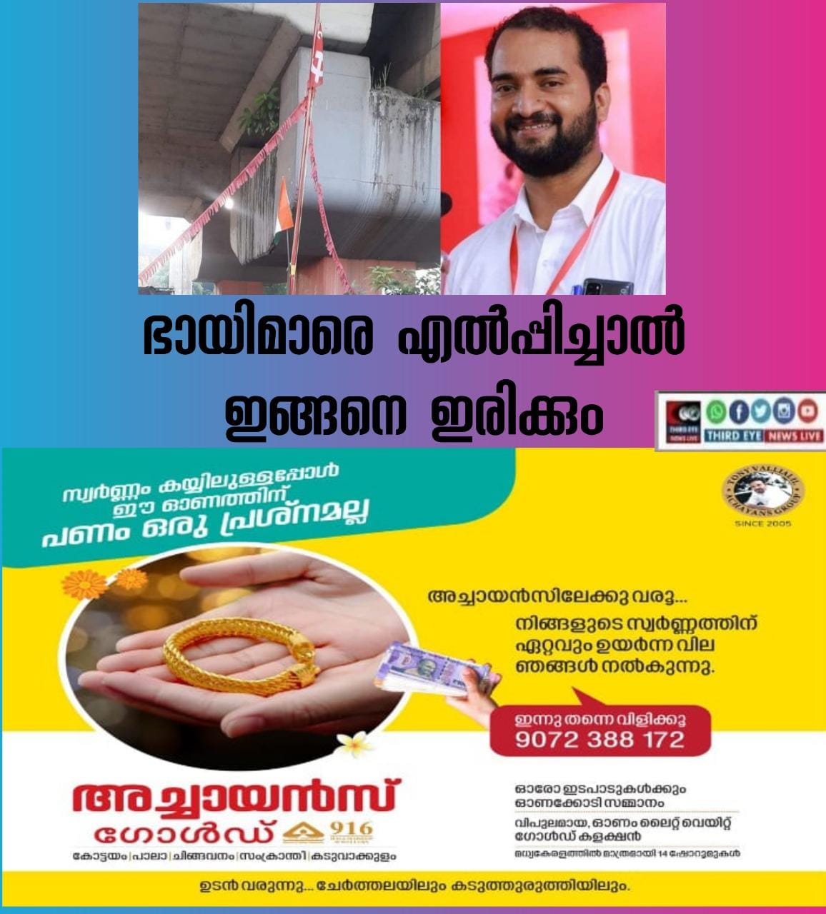 ‘ഭായിമാരെ എല്പിച്ചാല് ഇങ്ങനെ ഇരിക്കും….ജോഡോ യാത്രക്ക് കൊടികെട്ടാന് ഏല്പിച്ച കരാറുകാരായ ഭായിമാര് ആലുവ പച്ചക്കറി മാര്ക്കറ്റില് സിഐടിയു കൊടിമരത്തില് കോണ്ഗ്രസ്സിന്റെ കൊടി കെട്ടിയിരിക്കുന്നു… എന്താല്ലേ’.
