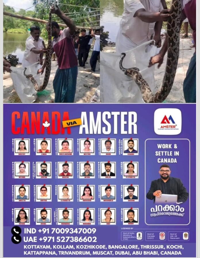 പുന്നപ്ര തെക്ക് പഞ്ചായത്ത് ഒന്നാം വാർഡ് നർബോണ ചാപ്പലിന് സമീപം പടിഞ്ഞാറ് ഭാഗത്താണ് എട്ടടി നീളവും ഏകദേശം 30 കിലോ തൂക്കവുമുള്ള മലമ്പാമ്പിനെ കണ്ടെത്തിയത്. മത്സ്യബന്ധന വലയില്‍ കുടുങ്ങിയ നിലയിലായിരുന്നു പാമ്പ്.