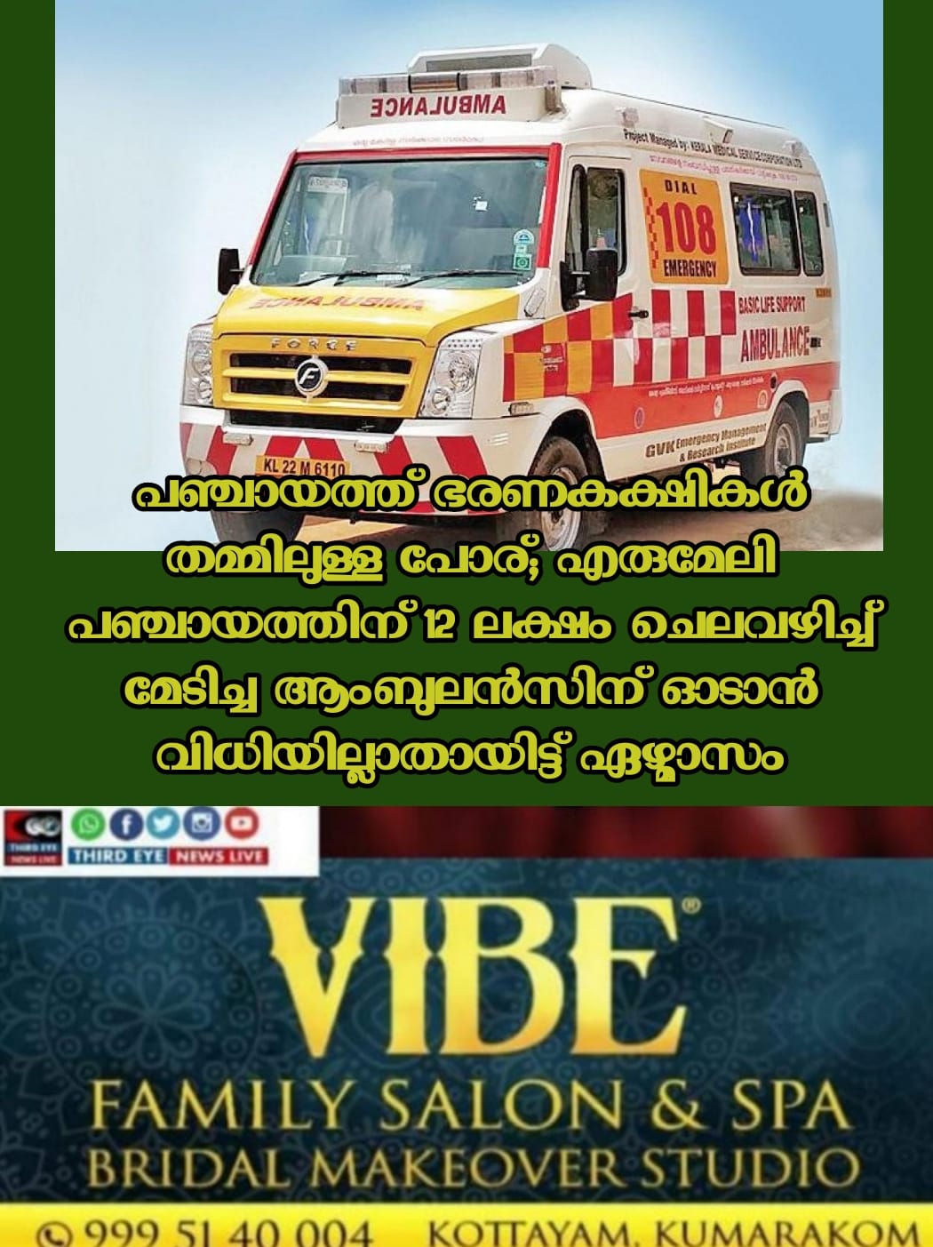 എരുമേലി : പഞ്ചായത്ത് വളപ്പിലെ സര്‍ക്കാര്‍ ഹോമിയോ ഡിസ്‌പെന്‍സറിയുടെ മുറ്റത്ത്12 ലക്ഷം ചെലവഴിച്ച്‌ മേടിച്ച ആംബുലന്‍സ് പഞ്ചായത്ത്‌ ഭരണകക്ഷികള്‍ തമ്മിലുള്ള പോര് മൂലം നിശ്ചമായിട്ട് , മാസം ഏഴ് കഴിഞ്ഞു. ആംബുലന്‍സ് അനുവദിച്ച ജില്ലാ പഞ്ചായത്ത്‌ ഡിവിഷന്‍ അംഗം മാസങ്ങള്‍ക്കുശേഷം ജില്ലാ പഞ്ചായത്ത്‌ വൈസ് പ്രസിഡന്‍റ് സ്ഥാനത്തേക്ക് അവരോധിക്കാറായിട്ടും ആംബുലന്‍സിന്റെ ശനിദശ മാറുന്നില്ല.