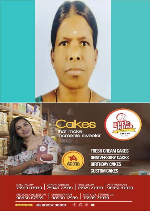 ഒരു മാസത്തോളമായി ചികിൽസയിലായിരുന്നു. പിതാവ്: വരിയൻ. മാതാവ്: കല്യാണി. ഭർത്താവ്: ചന്ദ്രൻ. മകൻ: നിധിൻ. സഹോദരങ്ങൾ: സുരേന്ദ്രൻ, സുരേഷ്ബാബു, പ്രദീപൻ, രാജൻ, രജനി.