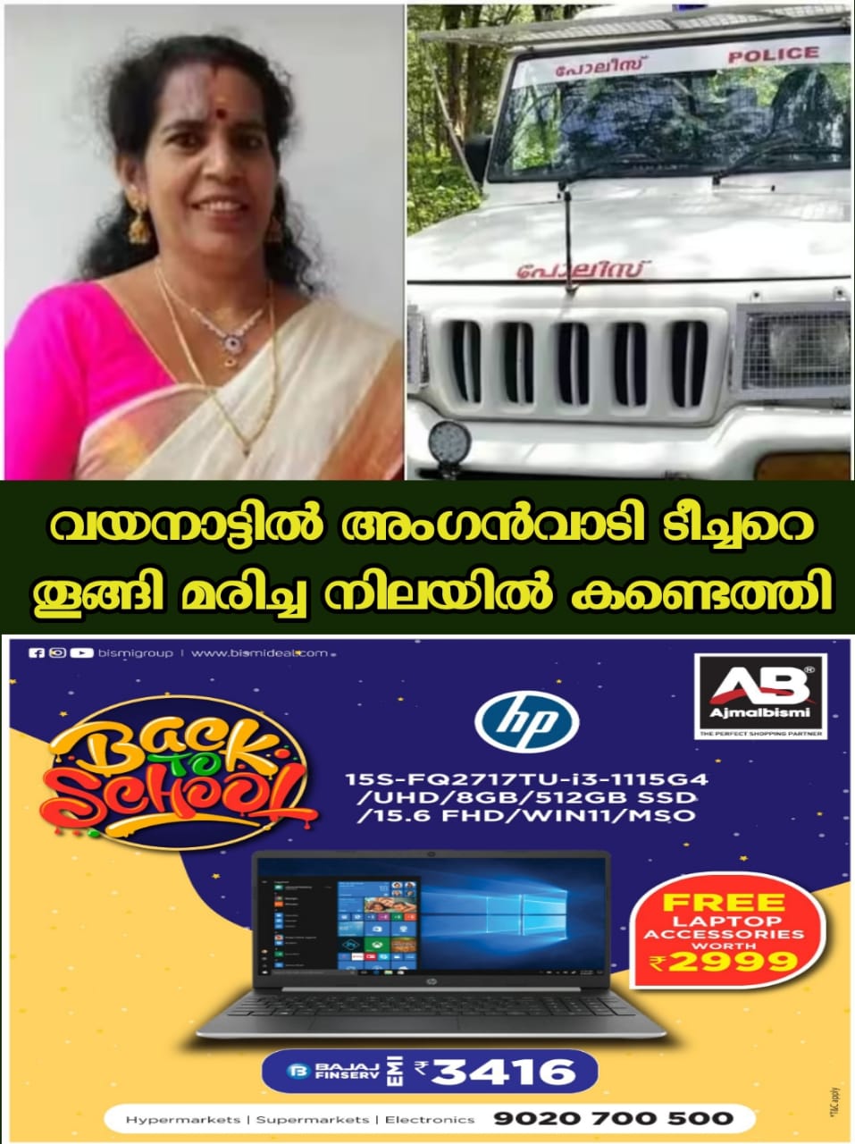 മേപ്പാടി: വയനാട്ടിൽ അംഗൻവാടി ടീച്ചറെ തൂങ്ങി മരിച്ച നിലയിൽ കണ്ടെത്തി. മേപ്പാടി അട്ടമലയിലെ ജലജാ കൃഷ്ണയെ വീടിനുള്ളിലാണ് തൂങ്ങി മരിച്ച നിലയിൽ കണ്ടത്.