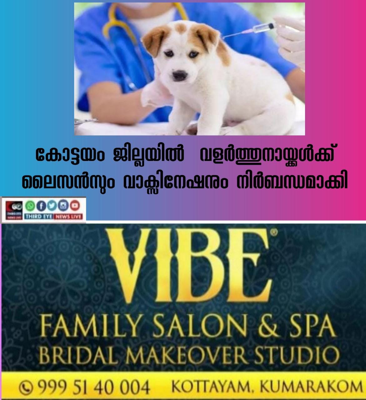 ജില്ലയിലെ മുഴുവൻ വളർത്തുനായ്ക്കൾക്കും പൂച്ചകൾക്കും തങ്ങളുടെ പഞ്ചായത്തിലെയോ മുനിസിപ്പാലിറ്റിയിലെയോ മൃഗാശുപത്രിയുമായി ബന്ധപ്പെട്ടുകൊണ്ട് ഉടമസ്ഥർ സെപ്റ്റംബർ 30ന് മുൻപായി പ്രതിരോധ കുത്തിവയ്പെടുക്കണം.