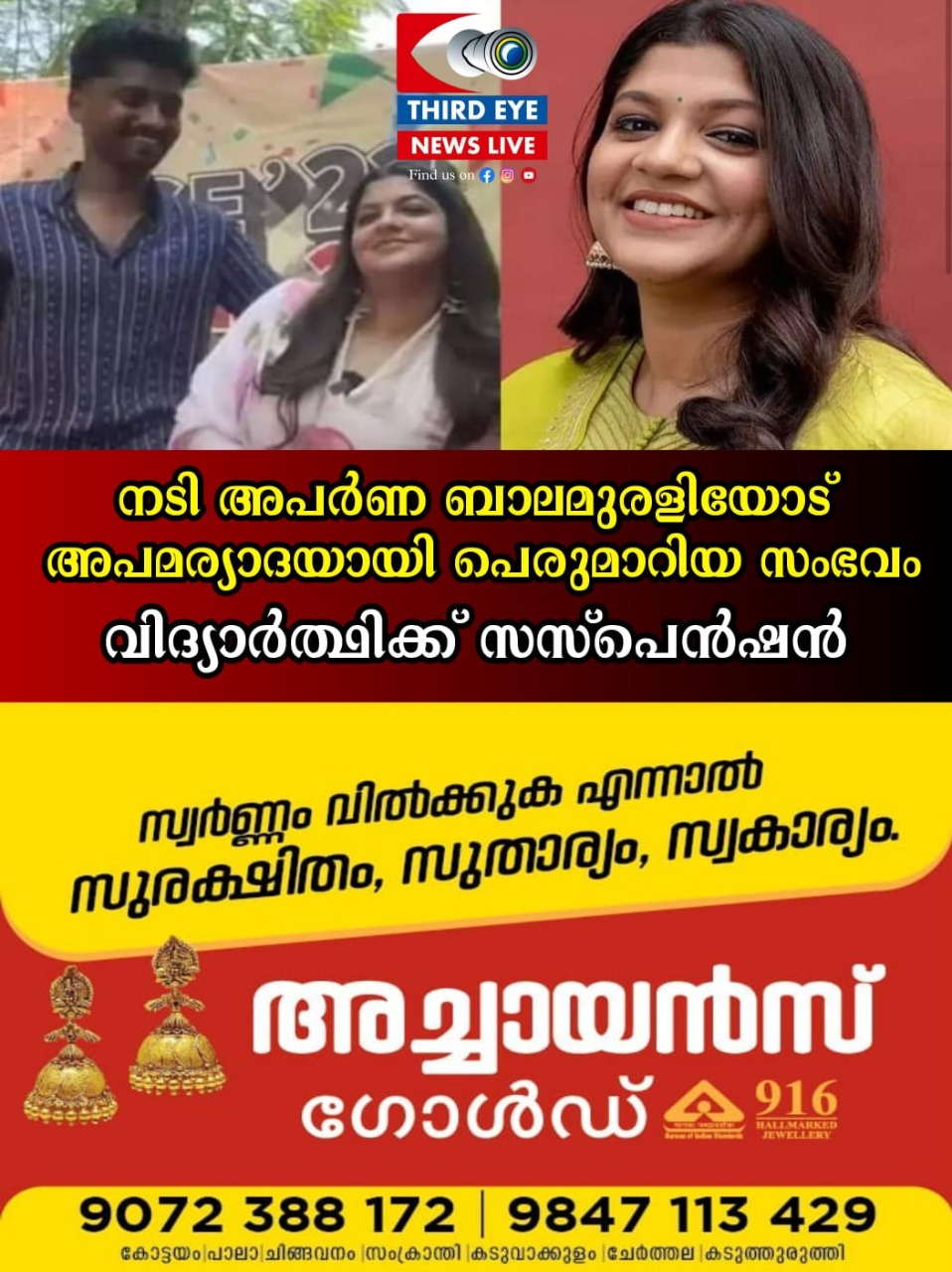 ബുധനാഴ്ചയാണ് കോളേജ് യൂണിയന് ഉദ്ഘാടനത്തിനായി എത്തിയ അപര്ണ മുരളിയോട് കോളേജിലെ വിദ്യാര്ത്ഥി വേദിയില് വച്ച് മോശമായി പെരുമാറിയത്. നടിക്ക് പൂവ് കൊടുക്കാന് വേണ്ടി വേദിയില് എത്തിയപ്പോഴായിരുന്നു സംഭവം. വേദിയില് എത്തിയ വിദ്യാര്ത്ഥി അപര്ണയുടെ കയ്യില് പിടിക്കുകയും തോളില് കൈ ഇടാന് ശ്രമിക്കുകയുമായിരുന്നു. എന്നാല് അനിഷ്ടം പ്രകടിപ്പിച്ച നടി എന്താടോ ലോ കോളേജ് അല്ലേ എന്ന് ചോദിച്ചു. സംഭവത്തെ കുറിച്ച് നടി പിന്നീട് ഫേസ്ബുക്കില് പ്രതികരിക്കുകയും ചെയ്തിരുന്നു.