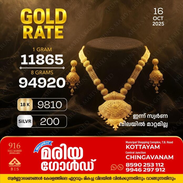 സംസ്ഥാനത്ത് ഇന്ന് സ്വർണ്ണവിലയിൽ മാറ്റമില്ല; അറിയാം കോട്ടയം അരുൺസ് മരിയ ഗോൾഡിലെ ഇന്നത്തെ(16/10/25) സ്വർണ്ണവില