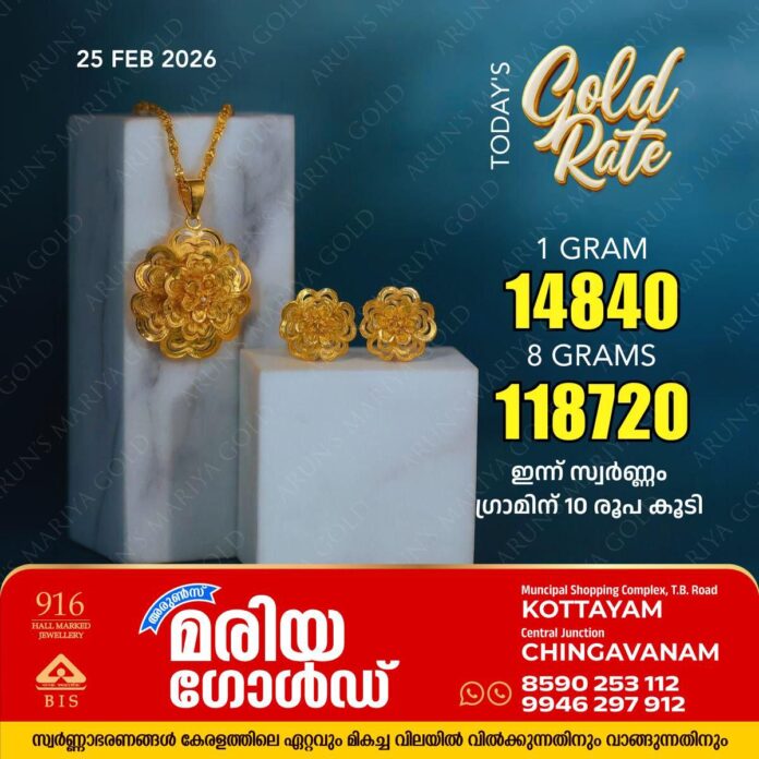 സംസ്ഥാനത്ത് ഇന്ന് (25/02/26) സ്വർണ്ണം ഗ്രാമിന് 10 രൂപ കൂടി; അറിയാം കോട്ടയം അരുൺസ് മരിയ ഗോൾഡിലെ ഇന്നത്തെ സ്വർണവില