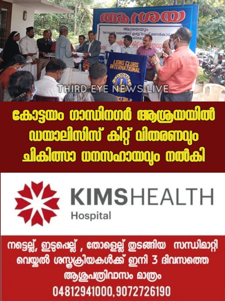 ഗാന്ധിനഗർ: ആശ്രയ ചാരിറ്റബിൾ ട്രസ്റ്റിന്റെ ആഭിമുഖ്യത്തിൽ എല്ലാ മാസവും നടത്തിവരുന്ന ഡയാലിസിസ് കിറ്റും, ധനസഹായവും ഈ മാസം മോഡൽ ലയൺസ് ക്ലബ് ഓഫ് മണർകാടും ആശ്രയയും ചേർന്ന് 145 വൃക്കരോഗികൾക്ക് നൽകി.