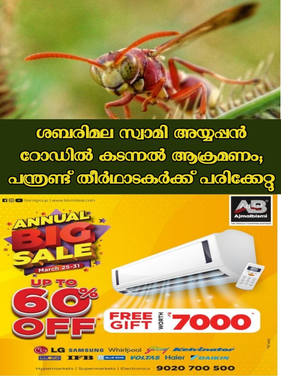 കടന്നല് കൂട് ഇളകി വീഴുകയായിരുന്നു. സ്വാമി അയ്യപ്പന് റോഡിലൂടെ തീര്ഥാടകരെ കടത്തി വിടുന്നത് നിര്ത്തി. നാല് പേരെ പത്തനംതിട്ട ജനറൽ ജനറൽ ആശുപത്രിയിൽ പ്രവേശിപ്പിച്ചു.