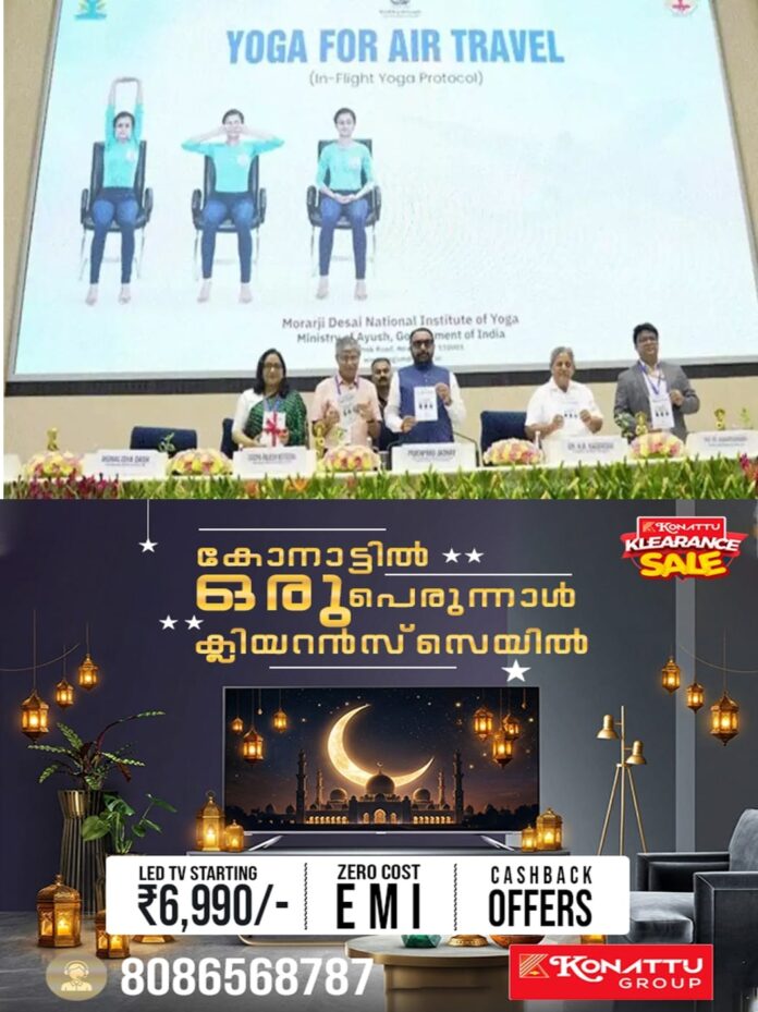 ന്യൂഡല്‍ഹി: വിമാനയാത്രക്കിടയിലെ ക്ഷീണം മാറ്റി മനസിനും ശരീരത്തിനും ഊര്‍ജം പകരാന്‍ സീറ്റിലിരുന്ന് അഞ്ച് മിനിറ്റ് യോഗ ചെയ്യാമെന്ന നിര്‍ദേശവുമായി കേന്ദ്ര ആയുഷ് മന്ത്രാലയം. ഇതിനായുള്ള പ്രോട്ടോക്കോള്‍ കേന്ദ്രമന്ത്രി പ്രതാപ് റാവു ജാദവ് പുറത്തിറക്കി. ഇതിൻ്റെ ഭാഗമായി ന്യൂഡല്‍ഹിയിലെ മൊറാര്‍ജി ദേശായി ഇന്‍സ്റ്റിറ്റ്യൂട്ട് ഓഫ് യോഗ പ്രത്യേക യോഗാസനങ്ങള്‍ വികസിപ്പിച്ചിട്ടുണ്ട്. യാത്രക്കിടെ സീറ്റിലിരുന്ന് ചെയ്യാവുന്ന യോഗാ മുറകളാണ് വികസിപ്പിച്ചത്.