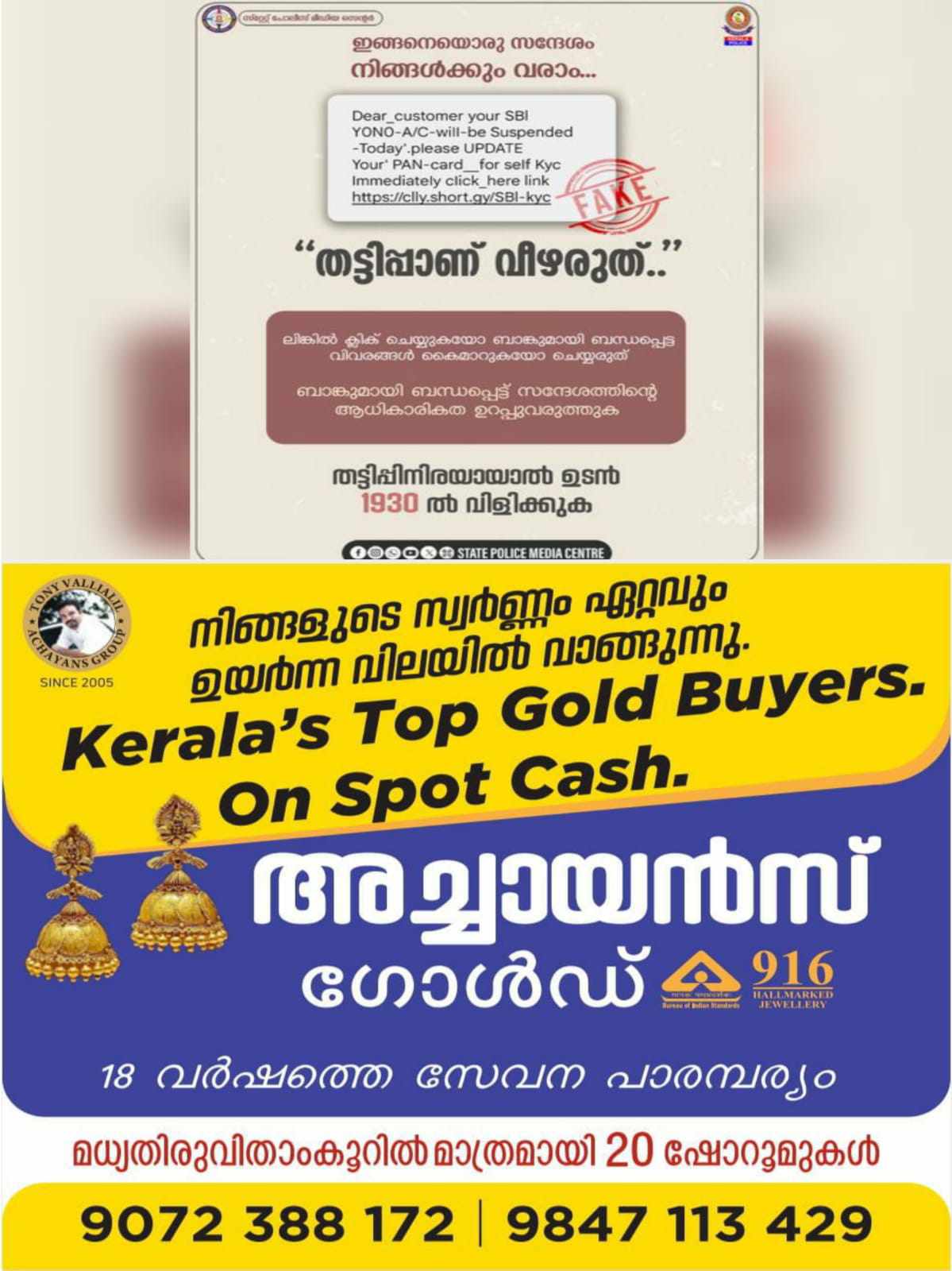 ഇങ്ങനെയുള്ള സന്ദേശം ലഭിച്ചാല് യാതൊരു കാരണവശാലും ലിങ്കില് ക്ലിക്ക് ചെയ്യുകയോ മെസ്സേജില് കാണുന്ന നമ്പറുകളില് ബന്ധപ്പെടുകയോ ചെയ്യരുതെന്നും കേരള പൊലീസ് ഫെയ്സ്ബുക്ക് കുറിപ്പിലൂടെ അറിയിച്ചു.