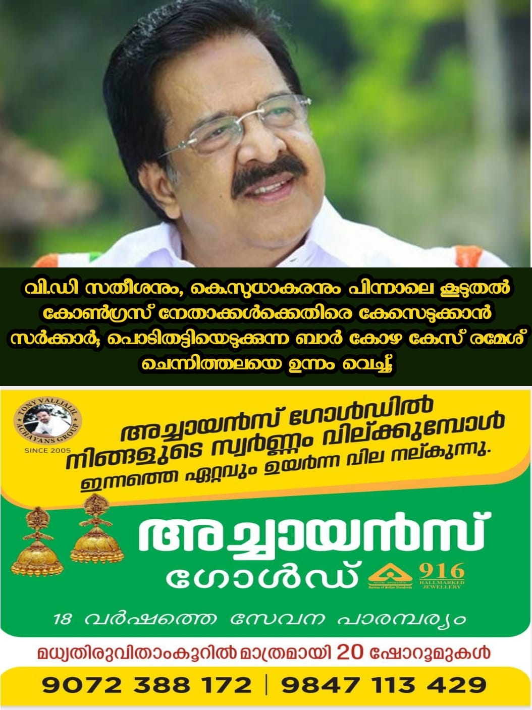 തിരുവനന്തപുരം: പഴയ ബാർകോഴ കേസ് പൊടിതട്ടിയെടുത്ത് വി.ഡി സതീശനും, കെ.സുധാകരനും പിന്നാലെ കൂടുതൽ കോൺഗ്രസ് നേതാക്കൾക്കെതിരെ കേസെടുക്കാൻ സർക്കാർ. രമേശ് ചെന്നിത്തലയടക്കമുള്ള നേതാക്കൾക്കെതിരെ പുതിയ നീക്കം.