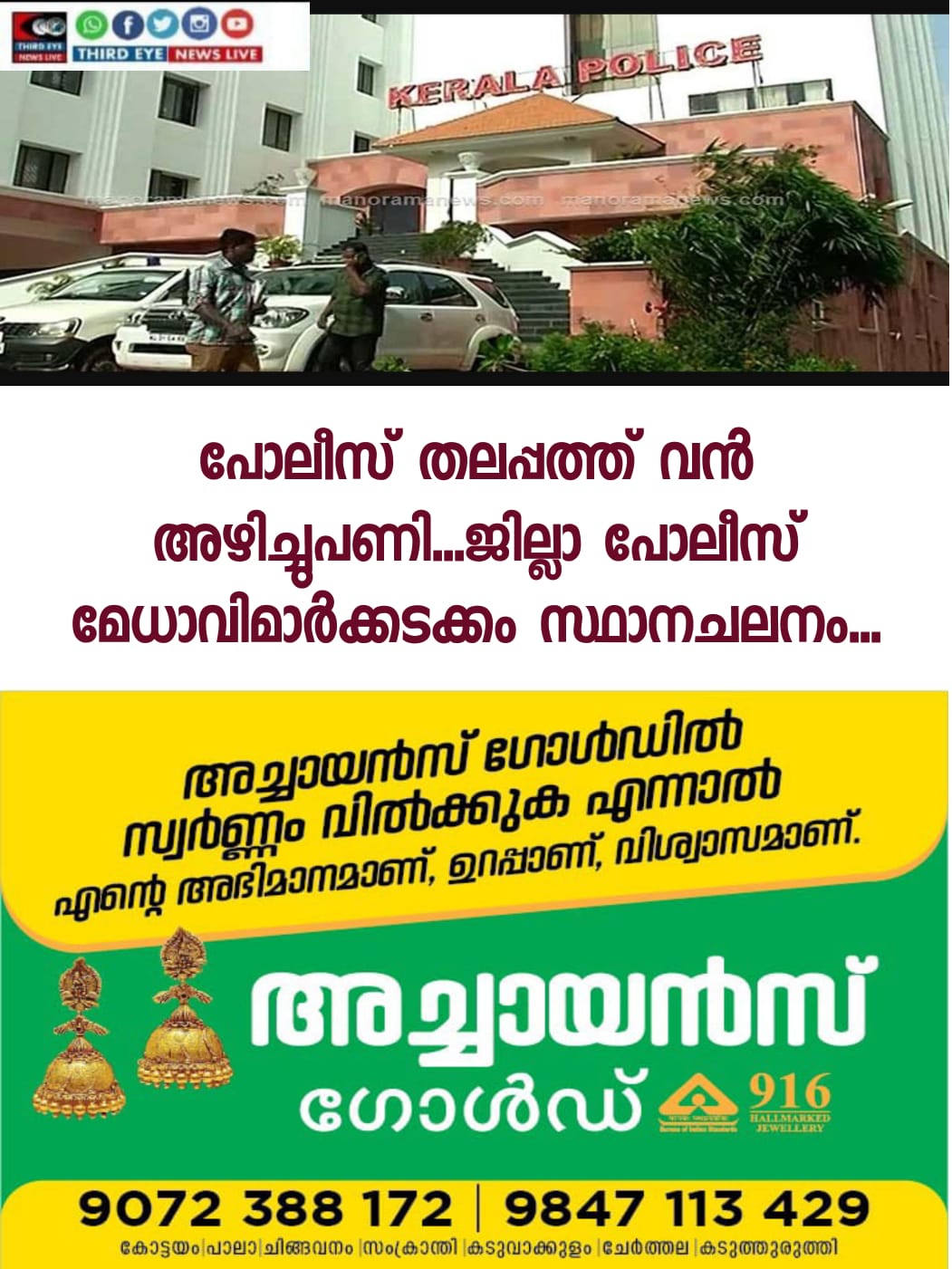 ​ജി.​ജ​യ്‌​ദേ​വി​നെ​ ​ആ​ല​പ്പു​ഴ​ ​പൊ​ലീ​സ് ​മേ​ധാ​വി​ ​സ്ഥാ​ന​ത്ത് ​നി​ന്ന് ​മാ​റ്റി​ ​എ​റ​ണാ​കു​ളം​ ​ആ​ന്റി​ ​ടെ​റ​റി​സ്റ്റ് ​സ്‌​ക്വാ​ഡ് ​(​ഓ​പ​റേ​ഷ​ൻ​)​ ​എ​സ്.​പി​യാ​യി​ ​നി​യ​മി​ച്ച​പ്പോ​ൾ​ ​ചൈ​ത്ര​ ​തെ​രേ​സ​ ​ജോ​ണി​നെ​ ​ആ​ല​പ്പു​ഴ​ ​ജി​ല്ല​ ​പൊ​ലീ​സ് ​മേ​ധാ​വി​യാ​യി​ ​പ​ക​രം​ ​നി​യ​മി​ച്ചു.​ ​ക​ണ്ണൂ​ർ​ ​സി​റ്റി​ ​പൊ​ലീ​സ് ​ക​മീ​ഷ​ണ​ർ​ ​ആ​ർ.​ഇ​ള​ങ്കോ​യെ​ ​കേ​ര​ള​ ​പൊ​ലീ​സ് ​ഹൗ​സിം​ഗ് ​ആ​ൻ​ഡ് ​ക​ൺ​സ്ട്ര​ക്ഷ​ൻ​ ​കോ​ർ​പ​റേ​ഷ​ൻ​ ​എം.​ഡി​യാ​യി​ ​നി​യ​മി​ച്ച​പ്പോ​ൾ​ ​തി​രു​വ​ന​ന്ത​പു​രം​ ​സി​റ്റി​ ​ഡി.​സി.​പി​ ​അ​ജി​ത് ​കു​മാ​റി​നെ​ ​ക​ണ്ണൂ​ർ​ ​സി​റ്റി​ ​പൊ​ലീ​സ് ​മേ​ധാ​വി​യാ​ക്കി.​ ​കെ.​എ.​പി​ ​ബ​റ്റാ​ലി​യ​ൻ​ ​ക​മാ​ഡ​ന്റ് ​അ​ൻ​കി​ത് ​അ​ശോ​ക​ൻ​ ​തൃ​ശൂ​ർ​ ​സി​റ്റി​ ​പൊ​ലീ​സ് ​ക​മീ​ഷ​ണ​റാ​കും.​ ​കൊ​ല്ലം​ ​റൂ​റ​ൽ​ ​ജി​ല്ല​ ​പൊ​ലീ​സ് ​മേ​ധാ​വി​ ​കെ.​ ​ബി.​ ​ര​വി​യെ​ ​വി​ജി​ല​ൻ​സ് ​തി​രു​വ​ന​ന്ത​പു​രം​ ​സ്‌​പെ​ഷ​ൽ​ ​സെ​ൽ​ ​എ​സ്.​പി​യ​യാ​യും​ ​ക​ണ്ണൂ​ർ​ ​റൂ​റ​ൽ​ ​ജി​ല്ല​ ​പൊ​ലീ​സ് ​മേ​ധാ​വി​ ​പി.​ബി.​രാ​ജീ​വി​നെ​ ​വ​നി​ത​ ​ക​മീ​ഷ​ൻ​ ​ഡ​യ​റ​ക്ട​ർ​ ​സ്ഥാ​ന​ത്തേ​ക്കും​ ​കോ​ഴി​ക്കോ​ട് ​സം​സ്ഥാ​ന​ ​സ്‌​പെ​ഷ​ൽ​ ​ബ്രാ​ഞ്ച് ​എ​സ്.​പി​ ​എം.​എ​ൽ​ ​സു​നി​ലി​നെ​ ​കൊ​ല്ലം​ ​റൂ​റ​ൽ​ ​ജി​ല്ല​ ​പൊ​ലീ​സ് ​മേ​ധാ​വി​യും​ ​നി​യ​മി​ച്ചി​ട്ടു​ണ്ട്.