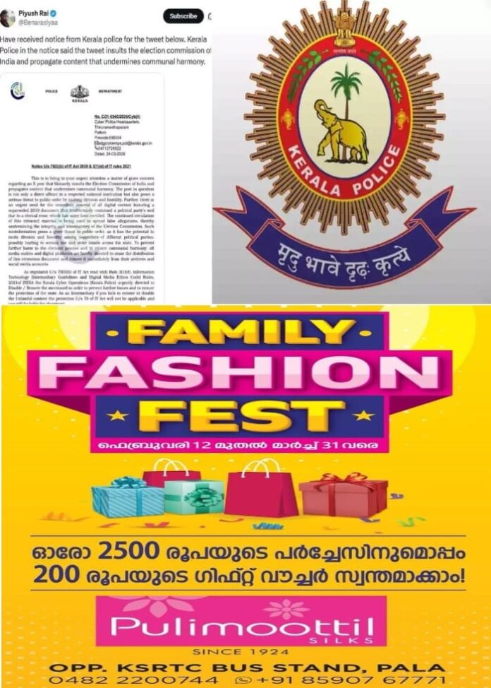 തന്റെ പോസ്റ്റ് തെരഞ്ഞെടുപ്പ് കമ്മീഷനെ അപമാനിക്കുന്നതും സാമുദായിക സൗഹാര്‍ദം തകര്‍ക്കുന്നതുമാണെന്ന് പൊലീസ് നോട്ടീസില്‍ ചൂണ്ടിക്കാട്ടിയതായി പീയുഷ് റായി പറഞ്ഞു. പോസ്റ്റുകള്‍ നീക്കം ചെയ്യാനുള്ള നോട്ടീസുകളാണ് സോഷ്യല്‍ മീഡിയയിലെ പൊലീസിന്റെ പ്രധാന ഇടപെടല്‍ രീതി. ജനങ്ങളെ ഭീഷണിപ്പെടുത്താനായി നിയമം ദുരുപയോഗം ചെയ്യുന്നതിന്റെ തെളിവാണിതെന്നും അദ്ദേഹം വിമര്‍ശിച്ചു. പിന്നാലെ പൊലീസ് നടപടിയെ പരിഹസിച്ചും അദ്ദേഹം പോസ്റ്റ് ചെയ്തിട്ടുണ്ട്. ‘തെരഞ്ഞെടുപ്പ് കമ്മീഷന്‍ ഇന്ത്യയിലെ ഏറ്റവും നിഷ്പക്ഷ ഭരണഘടനാ സ്ഥാപനമാണ്. തെരഞ്ഞെടുപ്പ് കമ്മീഷന് ചരിത്രപരമായ നേതൃത്വം നല്‍കിയ, ഏറ്റവും നന്നായി നയിച്ച കമ്മീഷണറാണ് ഗ്യാനേഷ് കുമാര്‍. ഈ പറഞ്ഞത് ഒ.കെ ആണോ കേരള പൊലീസേ?’ എന്നായിരുന്നു പീയുഷ് റായിയുടെ പോസ്റ്റ്.