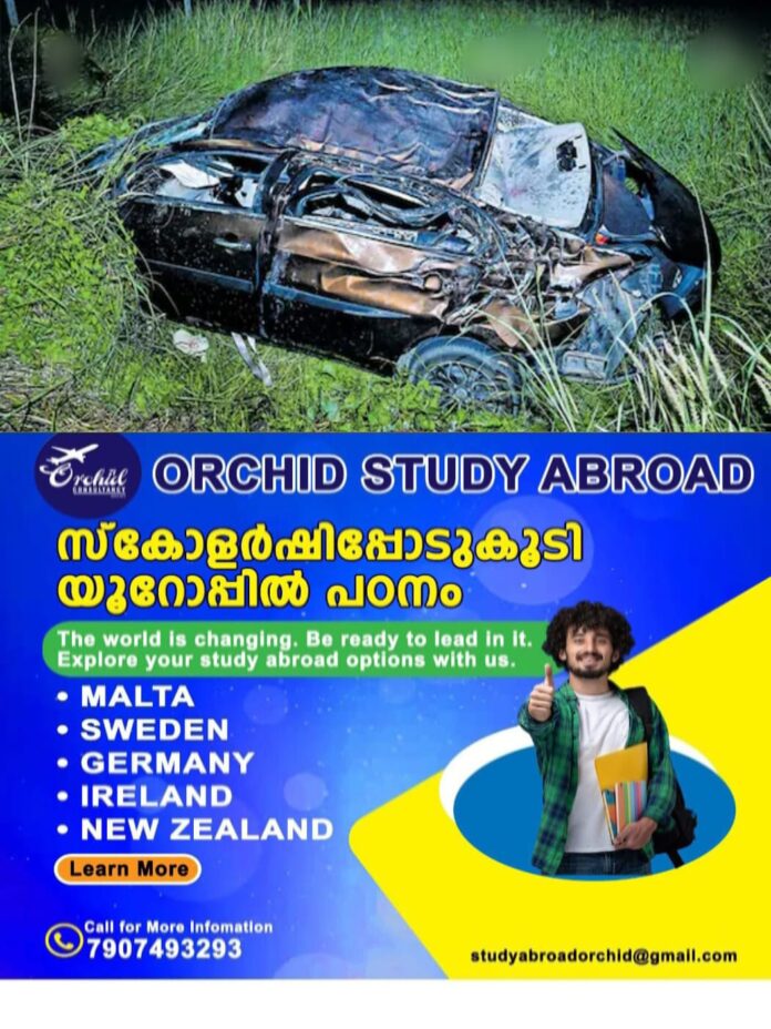 കാറിലുണ്ടായിരുന്ന 3 പേർക്കു സാരമായ പരുക്കേറ്റു. ഇന്നലെ രാത്രി പതിനൊന്നിനാണു സംഭവം.