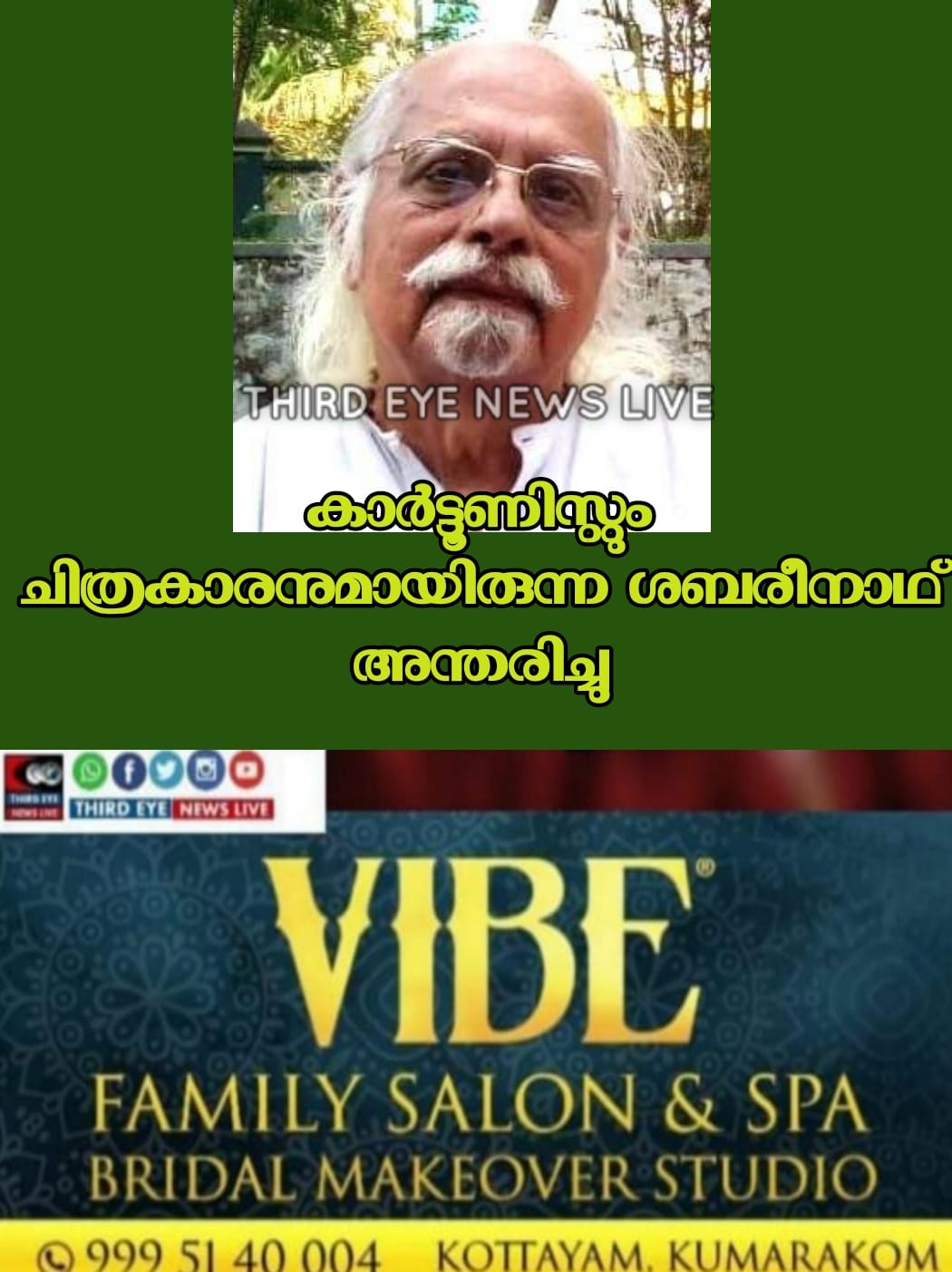 കോട്ടയം : കാര്ട്ടൂണിസ്റ്റും ചിത്രകാരനുമായിരുന്ന കോട്ടയം തിരുനക്കര കിഴക്കേടത്ത് വീട്ടില് ശബരീനാഥ് (87) തൃക്കാക്കരയില് നിര്യാതനായി.