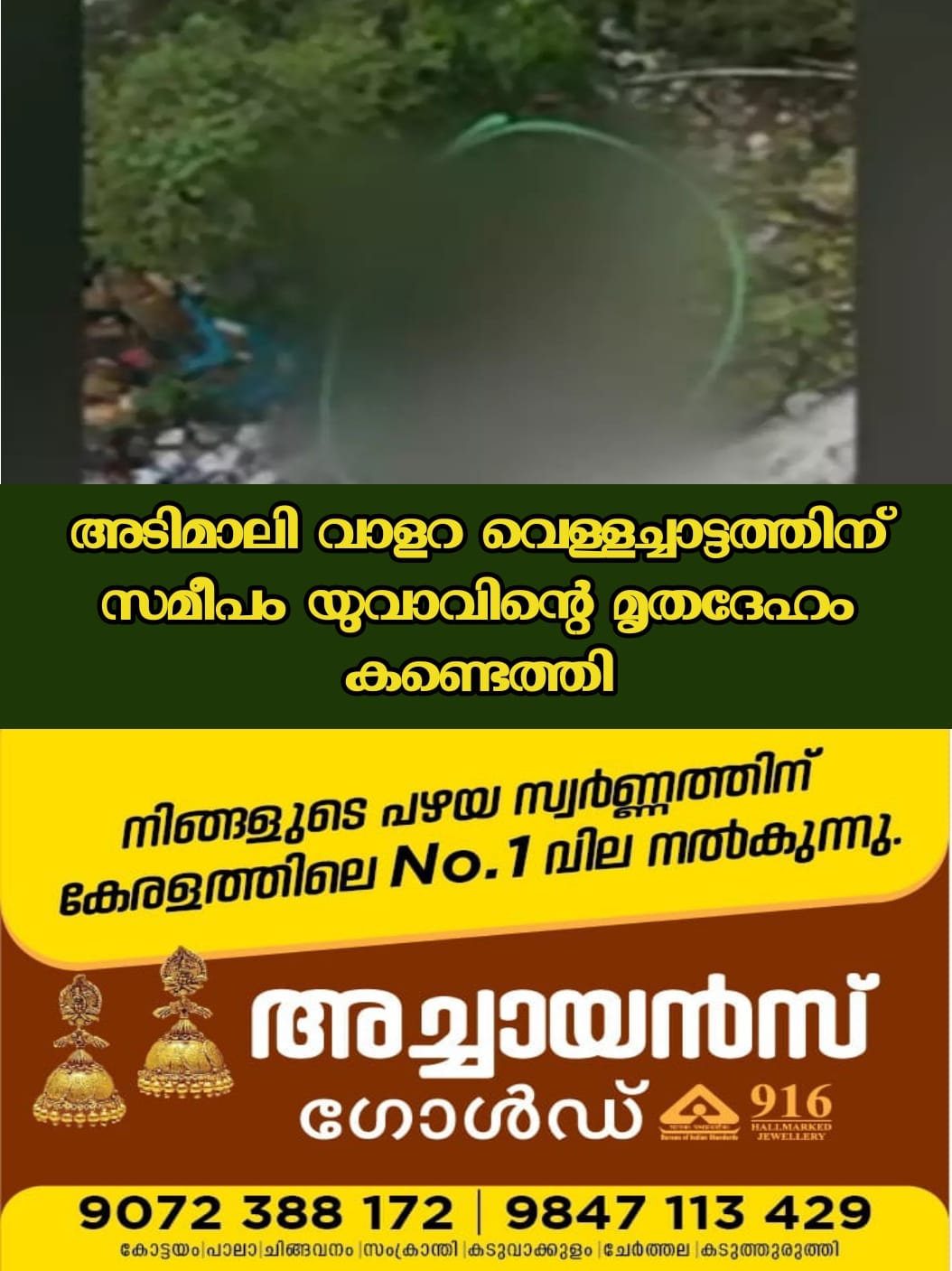 ഇടുക്കി: അടിമാലി വാളറ വെള്ളച്ചാട്ടത്തിന് സമീപം യുവാവിന്റെ മൃതദേഹം കണ്ടെത്തി. പുലര്ച്ചയുടെ നാട്ടുകാരാണ് മൃതദേഹം കണ്ടെത്തിയത്. കലുങ്കില് ഇരുന്ന് ഉറങ്ങിയപ്പോള് വഴുതി താഴേക്ക് വീണതാകാം എന്നാണ് പ്രാഥമിക നിഗമനം. മൃതദേഹം കണ്ടതോടെ നാട്ടുകാര് പൊലീസില് വിവരമറിയിക്കുകയായിരുന്നു.