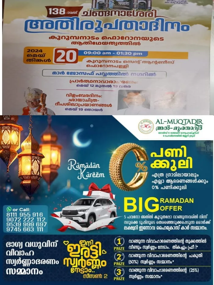 138-ാമത് ചങ്ങനാശ്ശേരി അതിരൂപതാദിനം മെയ് 20ന് കുറുമ്പനാടം സെന്റ് ആൻ്റണീസ് ഫൊറോനാ പള്ളിയിൽ നടക്കും.