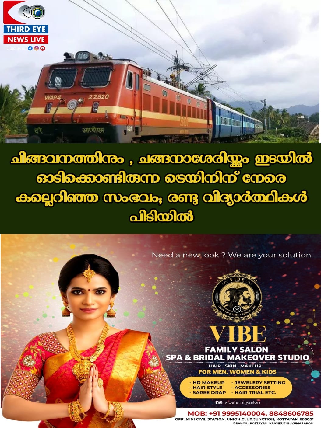 കോട്ടയം: ചിങ്ങവനത്തിനും , ചങ്ങനാശേരിയ്ക്കും ഇടയിൽ ഓടിക്കൊണ്ടിരുന്ന ട്രെയിനിന് കല്ലെറിഞ്ഞ രണ്ടു വിദ്യാര്ഥികളെ ആര്പിഎഫ് പിടികൂടി. ട്രെയിനുകള്ക്കു നേരെ കല്ലെറിഞ്ഞ വിദ്യാര്ത്ഥികളെയാണ് കോട്ടയം ആര്പിഎഫ് പിടികൂടിയത്.