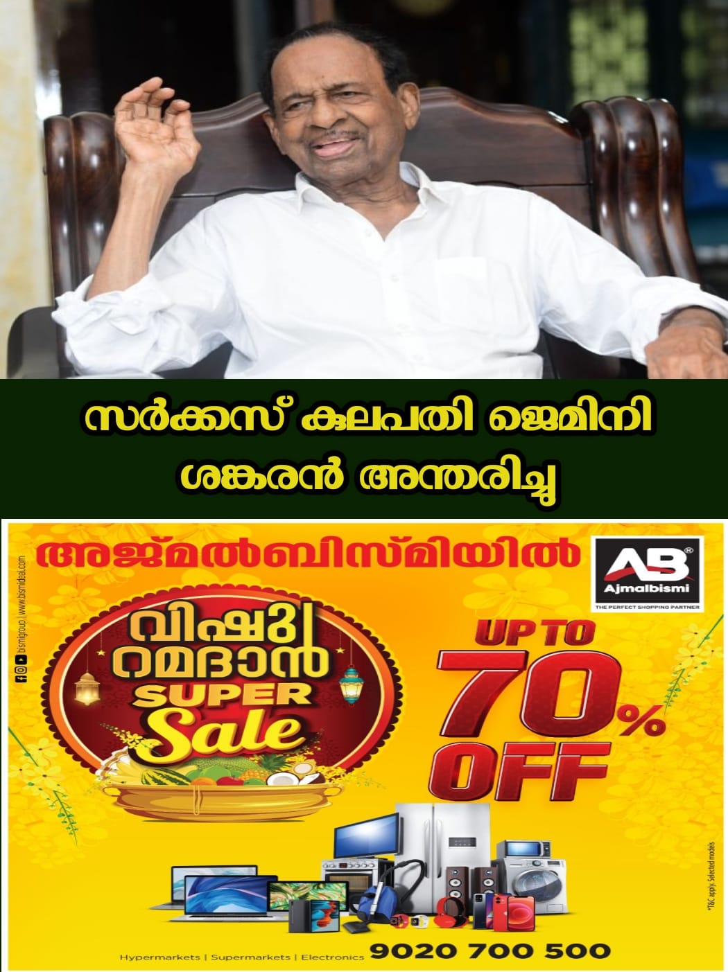 കണ്ണൂര്: സർക്കസ് കുലപതിയും കമ്യൂണിസ്റ്റ് സഹയാത്രികനുമായ ജെമിനി ശങ്കരൻ(99) അന്തരിച്ചു. കണ്ണൂരിലെ സ്വകാര്യ ആശുപത്രിയിൽ ഞായറാഴ്ച രാത്രി 11.40 നായിരുന്നു അന്ത്യം. വാർധക്യ സഹജമായ അസുഖങ്ങളെ തുടർന്ന് നാലുദിവസമായി ചികിത്സയിലായിരുന്നു. തിങ്കൾ പകൽ 11 മുതൽ വാരത്തെ വീട്ടിൽ പൊതുദർശനത്തിന് വയ്ക്കും. സംസ്കാരം ചൊവ്വാഴ്ച പയ്യാമ്പലത്ത്.