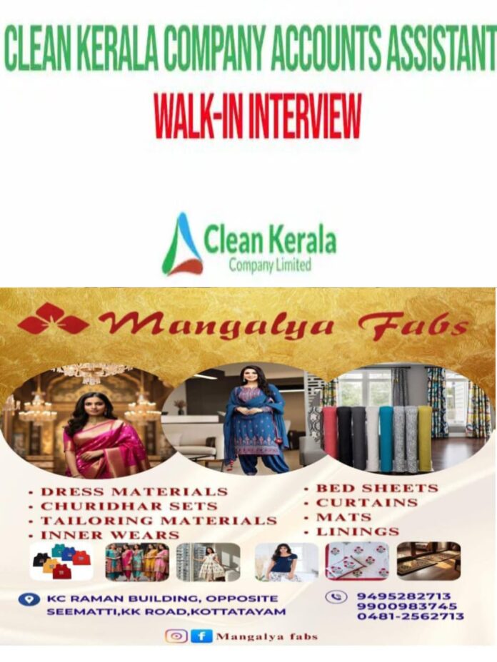 ക്ലീന് കേരള കമ്പനി ലിമിറ്റഡില് അക്കൗണ്ട്സ് അസിസ്റ്റന്റ്. കണ്ണൂര്, വയനാട് ജില്ല കാര്യാലയങ്ങളില് ഒഴിവ്. ദിവസ വേതനാടിസ്ഥാനത്തില് കരാര് നിയമനമാണ് നടക്കുക.