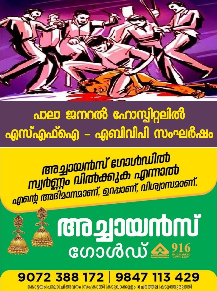 പാലാ:പാല ജനറൽ ആശുപത്രിയിൽ എബിവിപി – എസ്എഫ്ഐ പ്രവർത്തകർ തമ്മിൽ കൂട്ടത്തല്ല്. അത്യാഹിത വിഭാഗത്തിൽ ഉണ്ടായിരുന്ന ഡോക്ടർക്കും സംഘർഷത്തിൽ പരുക്കേറ്റു. കഴിഞ്ഞദിവസം പോളിടെക്നിക് കോളജിൽ നടത്തുന്ന ഇന്റർപോളി യൂണിയൻ ഉദ്ഘാടനവുമായി ബന്ധപ്പെട്ട് ഉണ്ടായ വാക്കേറ്റത്തിലും സംഘർഷത്തിലും പരുക്കേറ്റ എബിവിപി പ്രവർത്തകനെ അത്യാഹിത വിഭാഗത്തിൽ പ്രവേശിപ്പിച്ചിരുന്നു. ആശുപത്രിയിൽ എത്തിയ എസ്എഫ്ഐ പ്രവർത്തകരും എബിവിപി പ്രവർത്തകരും തമ്മിൽ സംഘർഷം ഉണ്ടാവുകയായിരുന്നു.
