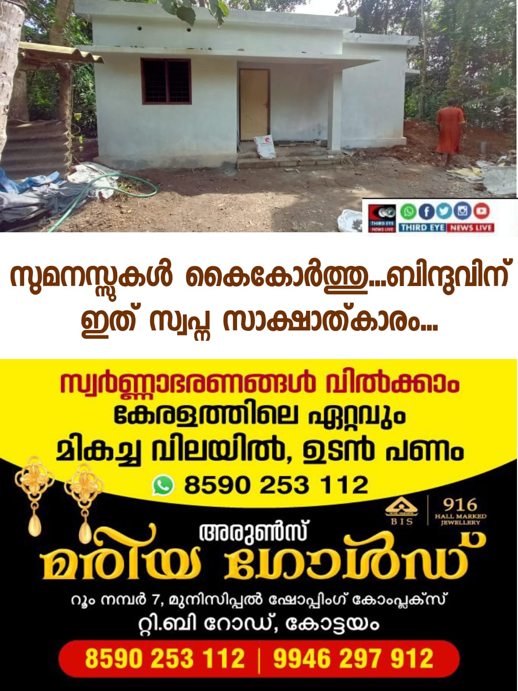അയർക്കുന്നം ഗ്രാമ പഞ്ചായത്തിലെ പന്ത്രണ്ടാം വാർഡിൽ അമയന്നൂർ പാറപ്പുറം വീട്ടിൽ ബിന്ദുവിന്റെ ജീവിതത്തിലെ ഏറ്റവും വലിയ സ്വപ്നമായിരുന്നു വാസയോഗ്യമായ അടച്ചുറപ്പുള്ള ഒരു വീട്.മാതാപിതാക്കൾ മരണപ്പെടുകയും അമിത മദ്യപാനിയായ ഭർത്താവുമായുള്ള വിവാഹബന്ധം വേർപ്പെടുത്തുകയും ചെയ്ത ബിന്ദു കൗമാരക്കാരനായ മകനോടൊപ്പം ഇടിഞ്ഞുവീഴാറായ വീട്ടിലായിരുന്നു താമസം.ബിന്ദുവിന്റെ ദയനീയ സ്ഥിതി മുൻ ഗ്രാമ പഞ്ചായത്തംഗവും സി.പി.ഐ (എം) അമയന്നൂർ ചപ്പാത്ത് ബ്രാഞ്ച് സെക്രട്ടറിയും ഡോക്ടറുടെ ബന്ധുവുമായ റജിമോൻ ജേക്കബ് ബിന്ദുവിന്റെ ദയനീയ സ്ഥിതി കേട്ടറിഞ്ഞ ഡോക്ടർ വീട് പണി സ്വയം ഏറ്റെടുക്കുകയായിരുന്നു. ഏകദേശം 8 ലക്ഷം രൂപയോളം ചിലവഴിച്ച് പണി പൂർത്തീകരണത്തിലേക്ക് അടുക്കുന്ന വീടിന്റെ താക്കോൽ ദാനം സി.പി.ഐ (എം) അയർക്കുന്നം ഏരിയാ സെക്രട്ടറി പി.എൻ ബിനു നവബർ 15 ന് നിർവ്വഹിക്കും. സിറ്റൗട്ട് ഹാൾ രണ്ട് കിടക്ക മുറി അടുക്കള ബാത്ത്റൂം ഉൾപ്പെടുന്ന വീടാണ് പൂർത്തീകരണത്തിലേക്ക് അടുക്കുന്നത്. വീട്ടിലേക്ക് വാഹനങ്ങൾ കയറാൻ ബുദ്ധിമുട്ടായതു മൂലം D Y F 1 അമയന്നൂർ മേഖലയിലെ സഖാക്കളാണ് നിർമ്മാണ സാമഗ്രികൾ സ്ഥലത്ത് എത്തിച്ചു നൽകിയത്.. സി.പി.എം.നേതൃത്വത്തിൽ അമയന്നൂരിൽ മൂന്നാമത്തെ വീടാണ് അടുത്ത മാസം കൈമാറുന്നത്.സുമനസ്സുകളുടെ സഹായം ബിന്ദുവിന്റെ ജീവിത സ്വപ്നമാണ് പൂവണിയിച്ചിരിക്കുന്നത്.