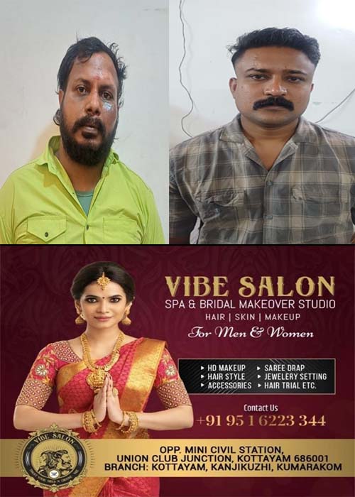 ഒന്നാം പ്രതി അയ്മനം വില്ലേജിൽ അയ്മനം കരയിൽ വിനീത് സഞ്ജയ് (37) മൂന്നാം പ്രതി ആർപ്പുക്കര വില്ലേജിൽ ആർപ്പുക്കര പടിഞ്ഞാറ് കരയിൽ അമൽ (25)എന്നിവരാണ് കോട്ടയം വെസ്റ്റ് പോലീസിന്റെ പിടിയിലായത്.