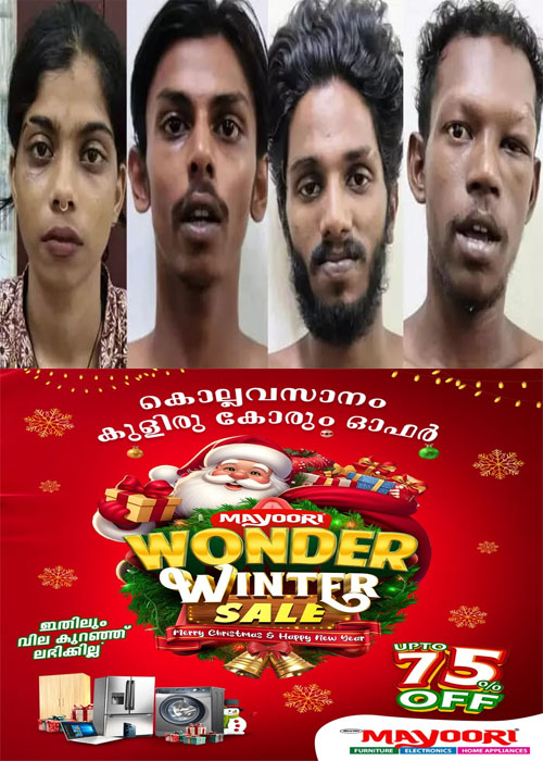 കോഴിക്കോട് കക്കാട് പുതുപ്പാടി കല്ലിങ്കല്‍ ഋഷലി (24), കടവന്ത്ര വാഴപ്പറമ്പില്‍ അലന്‍ (23), പറവൂര്‍ താന്നിപ്പാടം കമ്പിവേലിക്കകം തട്ടകത്ത് മിഥുന്‍ (മിഥുന്‍ ശാന്തി 29), തൃപ്പൂണിത്തുറ തെക്കുംഭാഗം കൊച്ചുപടന്നയില്‍ സിറാജ് (അമ്പാടി 19) എന്നിവരാണ് പിടിയിലായത്.